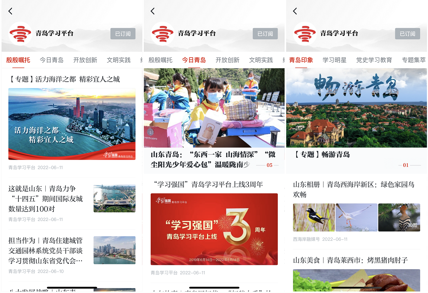 “内容为王、品质至上”是满足广大学员多元化学习需求的必然要求,也是青岛学习平台内容建设的根本原则。青岛学习平台开设“殷殷嘱托”“今日青岛”“开放创新”“文明实践”“经略海洋”“时尚之城”“乡村振兴”“学习时间”“品牌之都”“青岛印象”“学习明星”“党史学习教育”“专题集萃”“强国征文”14个栏目,坚持把握主题、推进原创,组织刊发了一批精准高效、质优量足的宣传作品,成为广大党员干部群众学思践悟的“掌中宝”和展现青岛高质量发展成就的重要阵地。