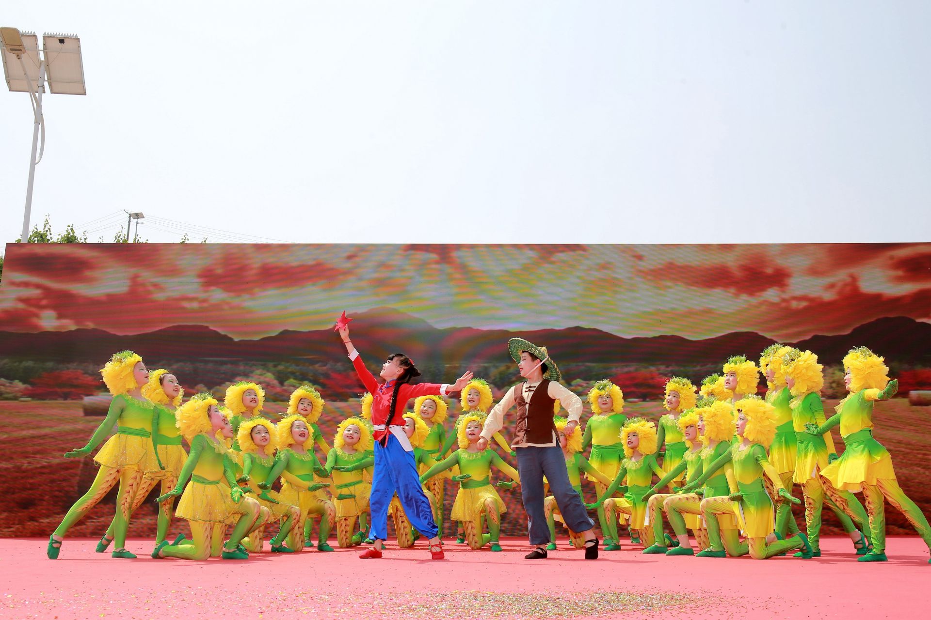 在“学习强国”助力乡村振兴非遗项目及特色农产品推介展销活动启动仪式上,夏庄小学学生表演乡村振兴主题舞蹈《俺家的麦田》