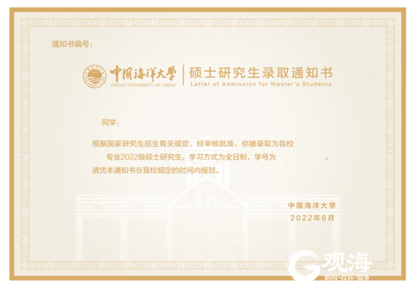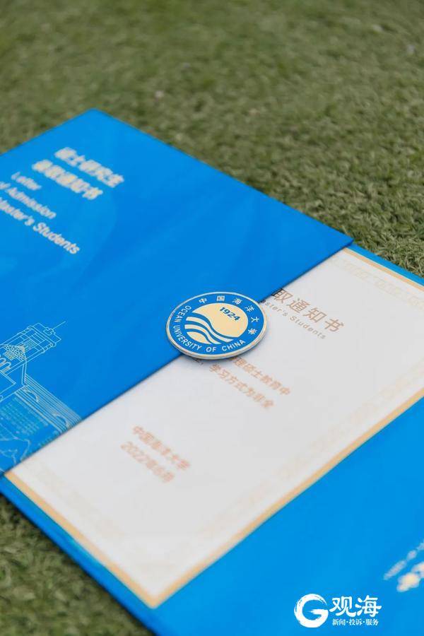 青岛日报社/观海新闻6月13日讯 今天,中国海洋大学新版研究生录取通知书亮相。录取通知书以蓝色为主色调,正面以蓝色丝绸纹路打底,文字和校徽采用烫金工艺,一校门图案采用uv工艺,象征着莘莘学子“金榜题名”。