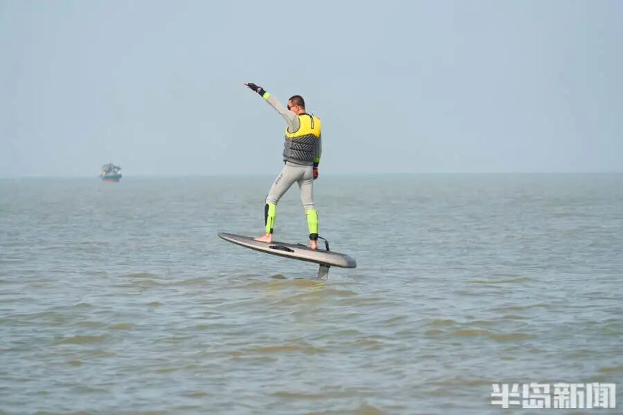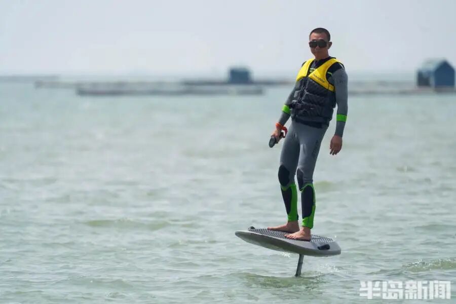 近日,50岁的青岛“水上飞人”刘继亮,驾驶电动水翼冲浪板(下文简称电动水翼板),在海口秀英帆船港成功登岸