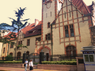 位于太平角一路18号和湛山三路2号交叉处的院落很大,院中草木繁盛,环境清幽,两座90多岁高龄的老别墅小巧别致,红色屋顶掩映在松柏和爬山虎编织的一片葱茏中,院墙外的街道,迎面即见大海……青岛“红瓦绿树 碧海蓝天”的标志性风貌,穿越近百年风雨,微缩于太平湾畔这处占地4000平方米的典型欧式庭院中。