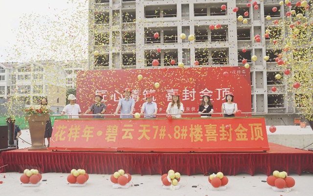 随着花样年青岛公司的领导与到场嘉宾上台共同为封顶仪式洒金,并由主持人隆重宣布:花样年•碧云天7#8#楼喜封金顶!祝贺花样年•碧云天项目全线顺利封顶!
