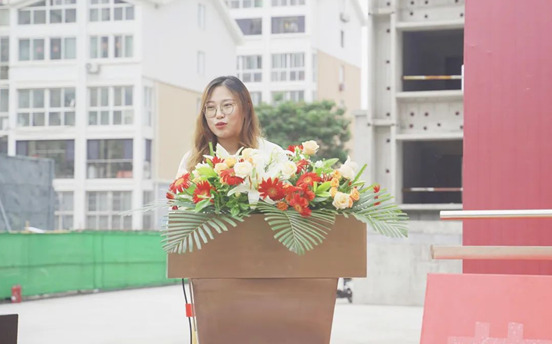 随后,上台致辞的是花样年青岛公司营销管理部负责人杨明鑫女士,在向各位领导和来宾表达了感谢后,她在致辞中阐述了花样年•碧云天团队克服疫情的影响,在确保工程质量的同时,如期完成工程计划,用实际行动践行匠心精神。