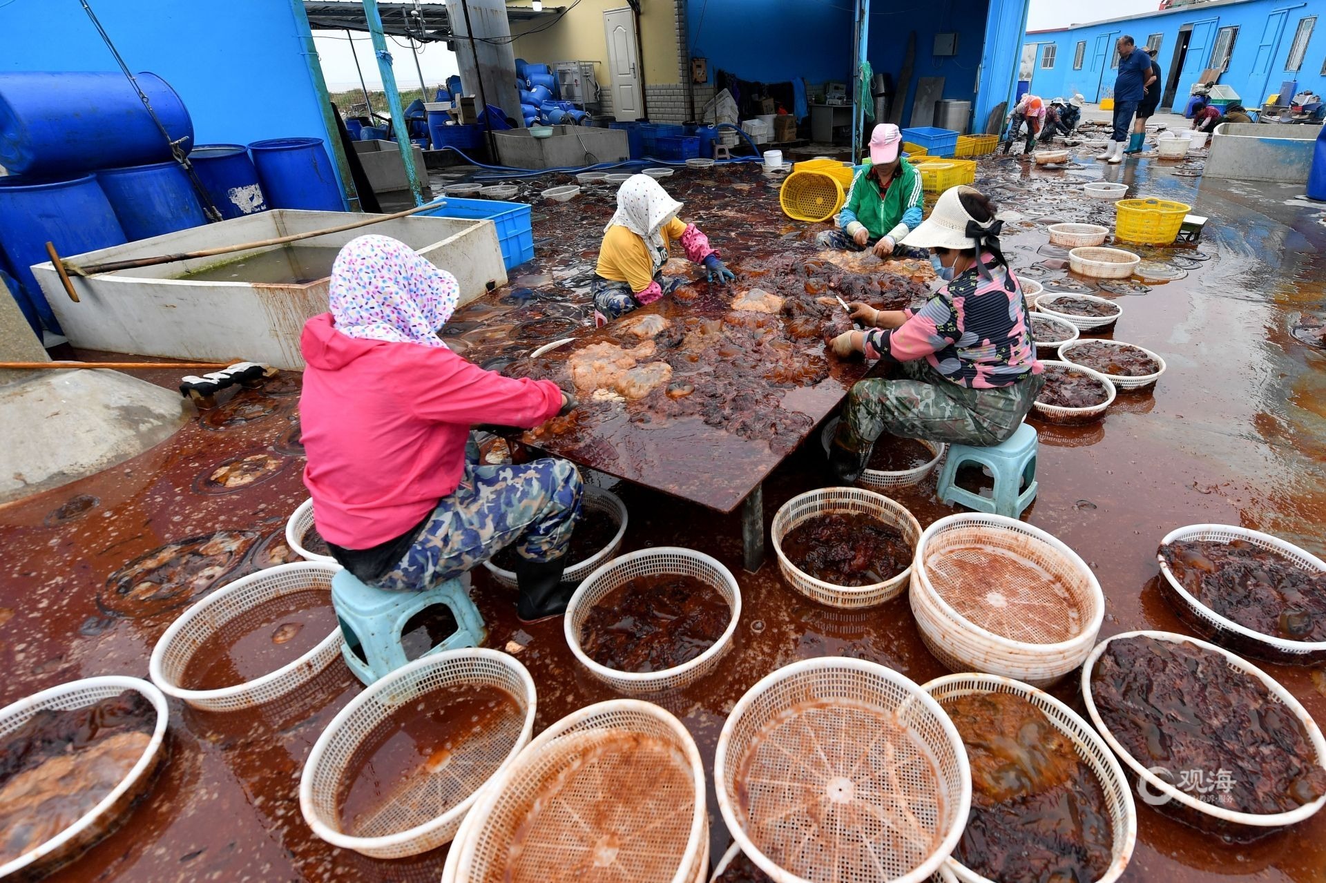 - 渔民集中对海蜇进行分割处理。