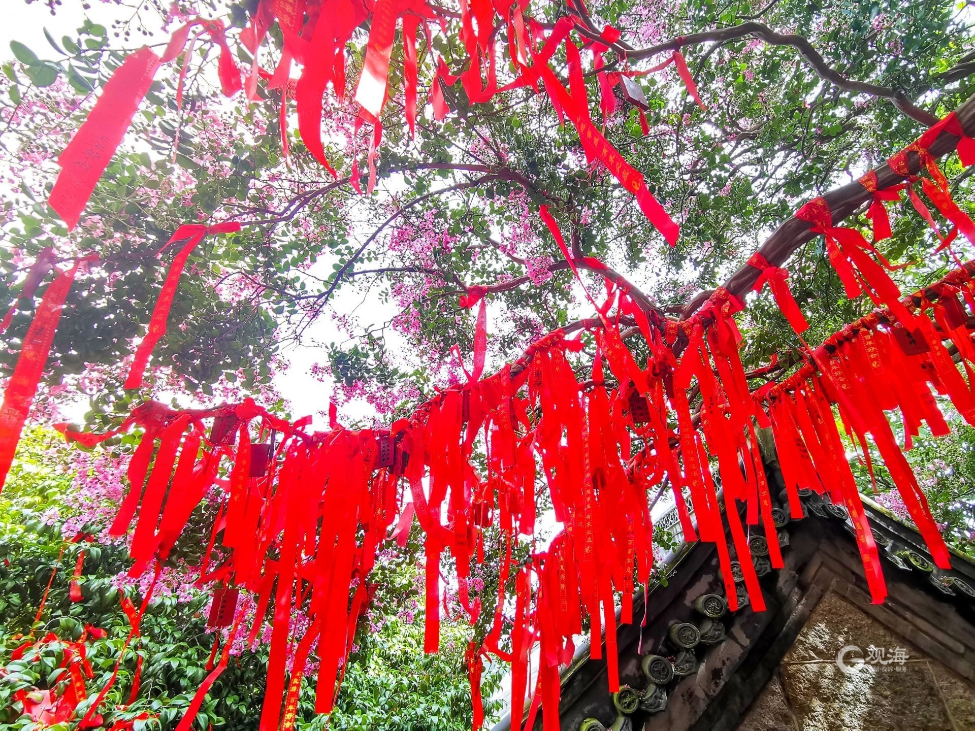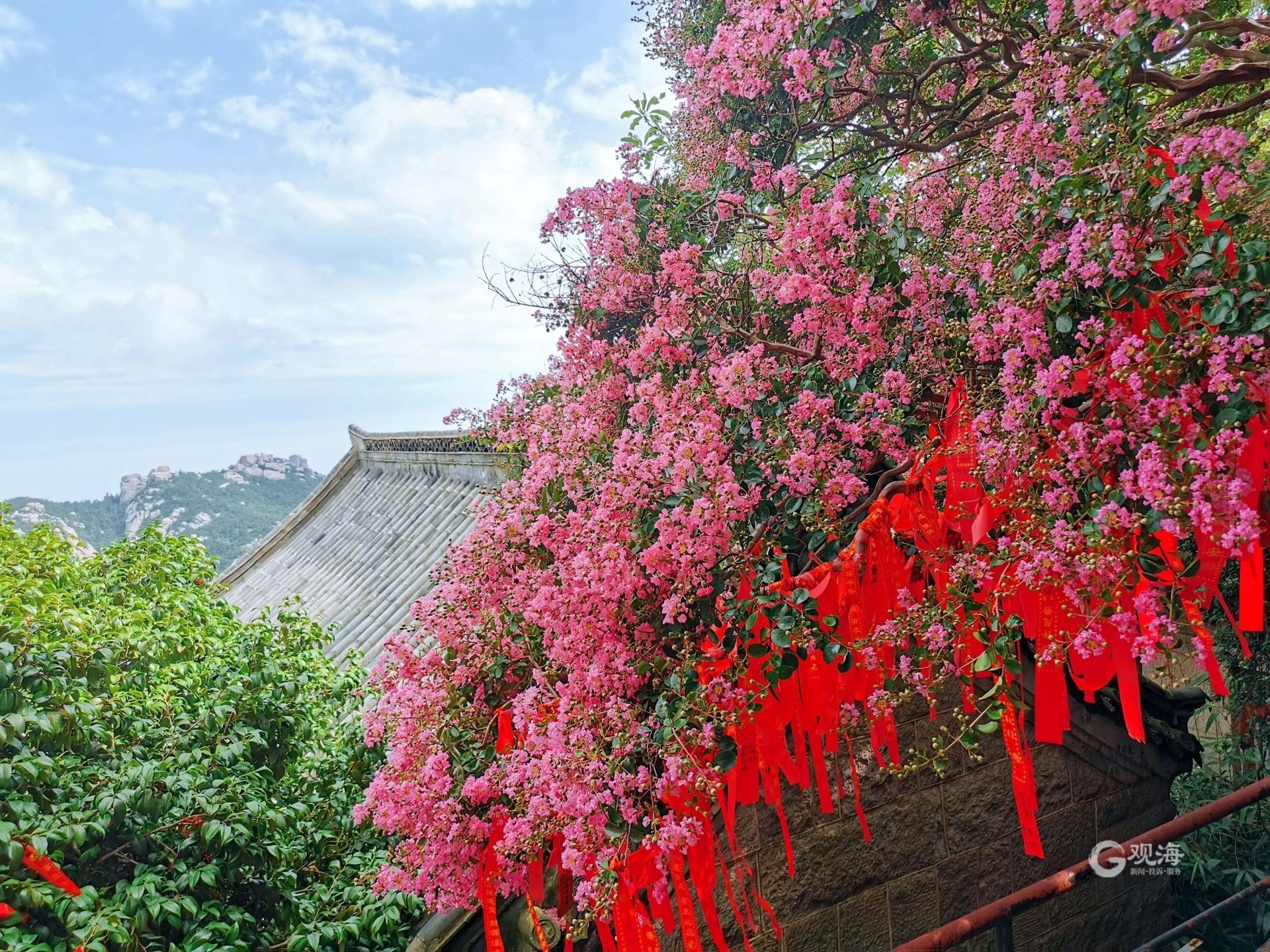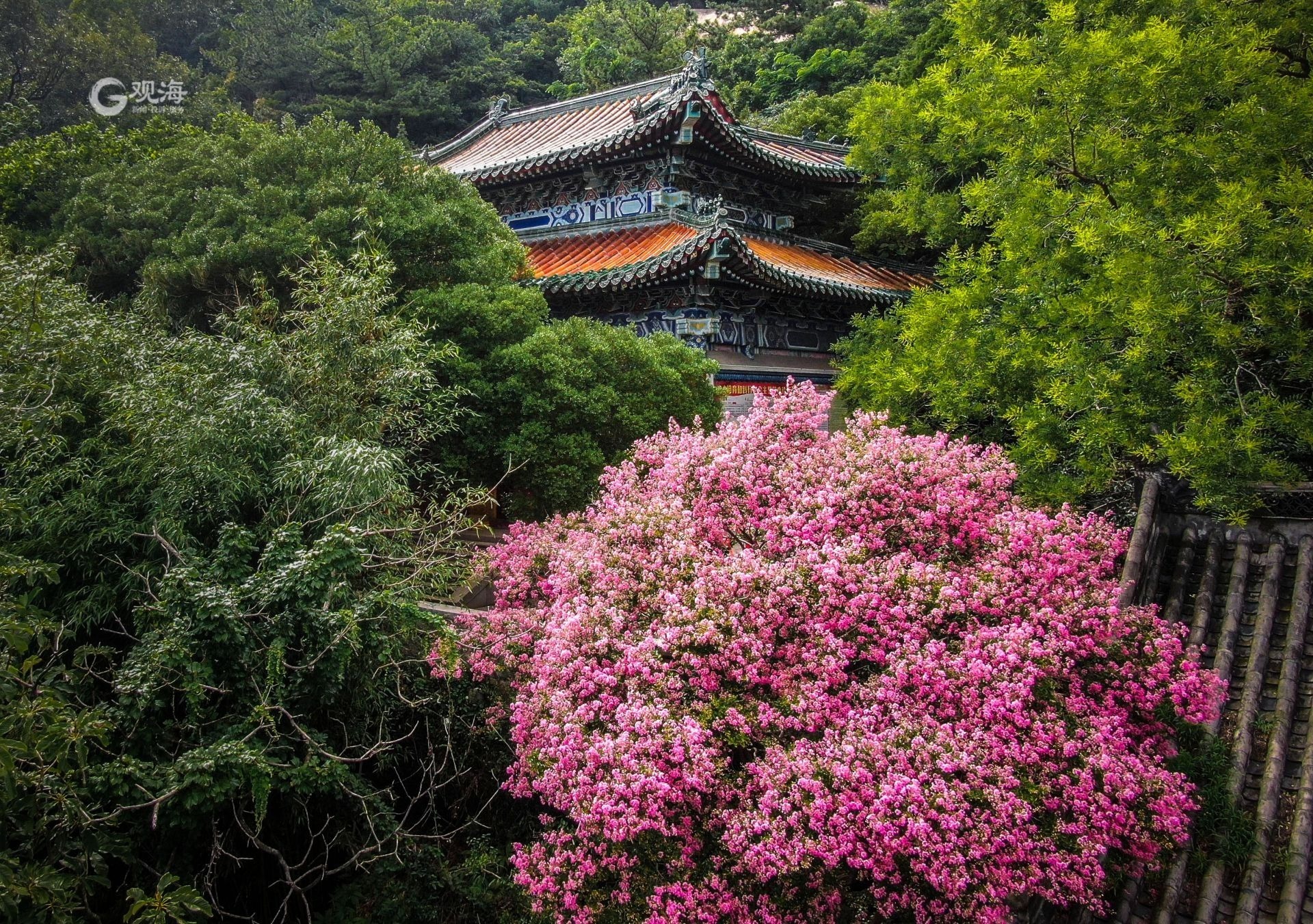 美呆了!崂山这株600岁的花树盛开啦 ©原创 2022-08-02 12:46 青岛日报社/观海新闻 赵健鹏 深藏于崂山太清景区的明霞洞,一棵紫薇正进入盛花期。这棵紫薇扎根道观石墙缝隙之中,顽强生长了600余年。大片大片的粉紫色花簇在道观灰瓦上空绽放,如同紫色云霞格外灵动。(青岛日报/观海新闻记者 赵健鹏摄 责任编辑 樊蓉) 金瓦、绿树、紫薇花。 明霞洞道观中的紫薇花进入盛花期。 盛开的紫薇花如空中云霞。 游客在明霞洞前悬挂了许多祈福红绸。 满目苍翠中,一簇紫薇明艳盛开。 道观灰瓦上落下紫薇花瓣。
