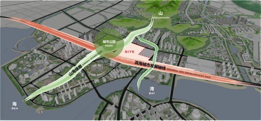 项目用地南侧靠近星光岛,北侧面山,西侧与城市公园隔路相望,拥有较为良好的景观资源,规划设计时如何整合周边景观资源,将山、海、公园景观引入项目内加以利用,是本项目规划设计的要点。
