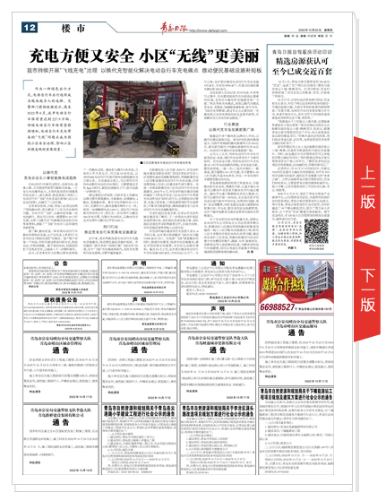 在新建住宅小区方面,2021年,市住房和城乡建设局联合多部门印发《青岛市住宅小区智慧化基础设施配置指南》,明确新建住宅小区须配套建设电动自行车充电设施,并将该要求纳入住宅小区建设条件进行落实。为进一步规范新建住宅小区电动自行车充电设施建设,2022年6月,市住房和城乡建设局组织编制了《青岛市住宅小区电动自行车停放充电场所设计导则(试行)》,分类提出设计要求,在施工图审查、工程监督管理环节加强管控,开展项目抽查检查,确保新建住宅小区电动自行车充电设施配建到位。