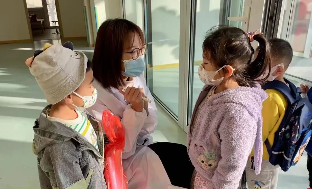 一进幼儿园的门厅,保健医已经穿戴整齐,准备晨检了。轻声细语地询问、规范细致的步骤,让孩子们把卫生、安全带进教室。