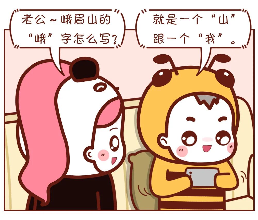 看到肥蜂在客厅打游戏打得正入迷,于是我假装不经意地问了他一句:“老公,峨眉山的‘峨’字怎么写?”肥蜂头都没抬,一边继续打游戏,一边回答我:“就是一个‘山’跟一个‘我’。”很好,第一步完成,接着就是:假装没听懂,继续问他:“什么?什么我?”