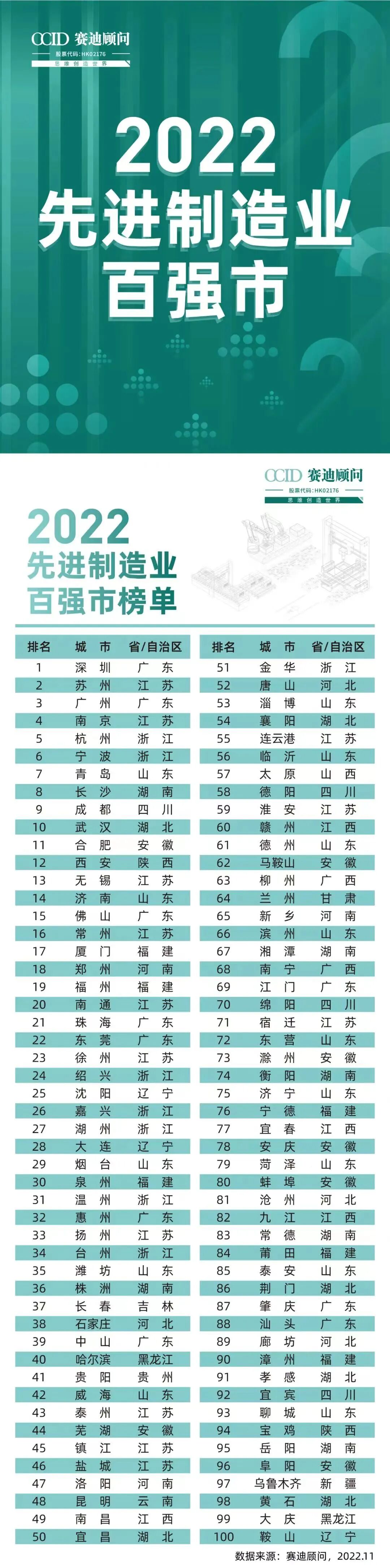 11月23日,工业和信息化部直属单位赛迪研究院赛迪顾问发布先进制造业百强市(2022)研究成果,围绕创新能力、融合发展、经济带动、品牌质量和绿色集约五个维度,以全国293个地级市为样本,对各城市先进制造业发展情况进行定性及定量研究,形成了2022先进制造业百强市榜单。