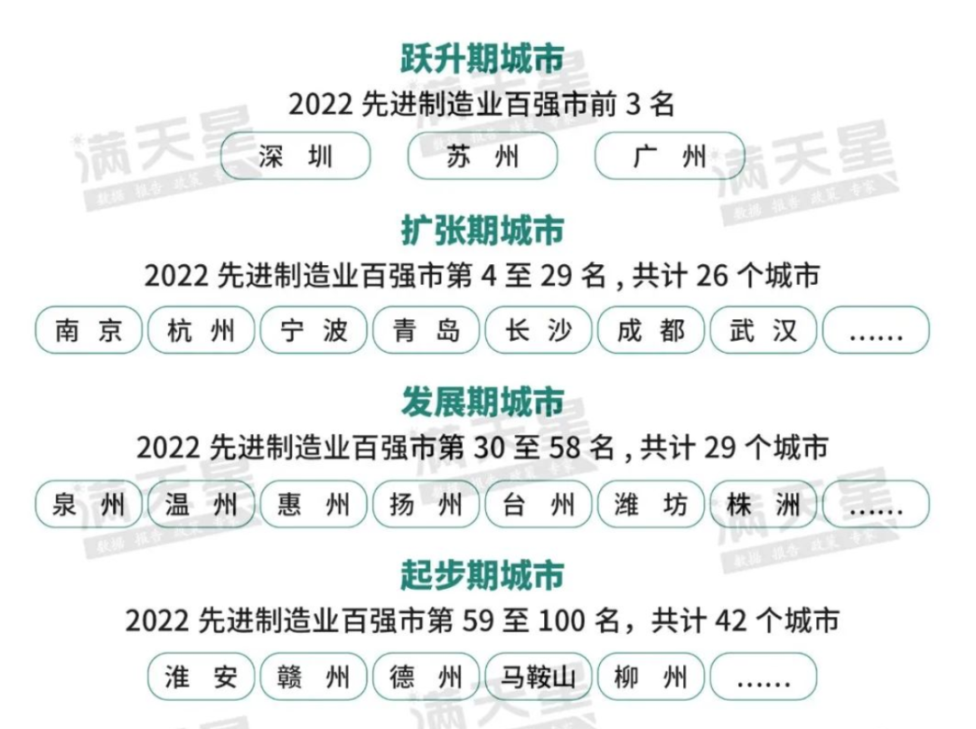 发展期城市主要是2022先进制造业百强市第30至58名,包括泉州、温州、惠州、扬州、台州、潍坊、株洲等29个城市。