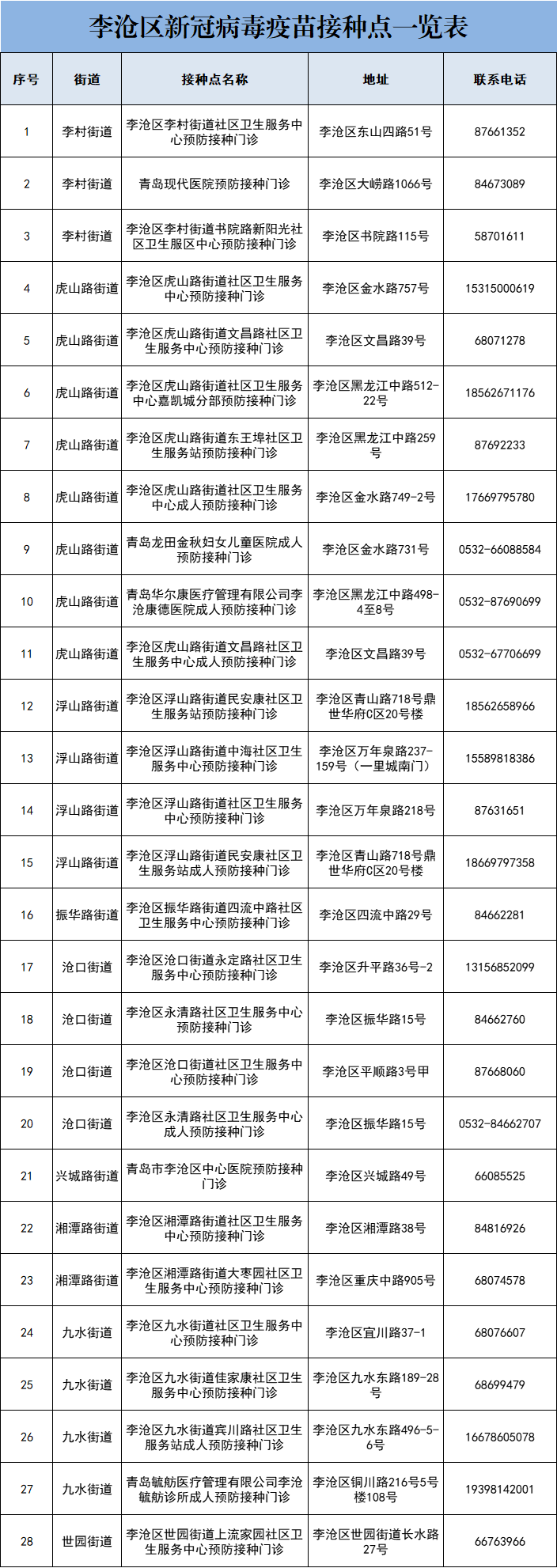 最新收藏!李沧区新冠病毒疫苗接种点一览表