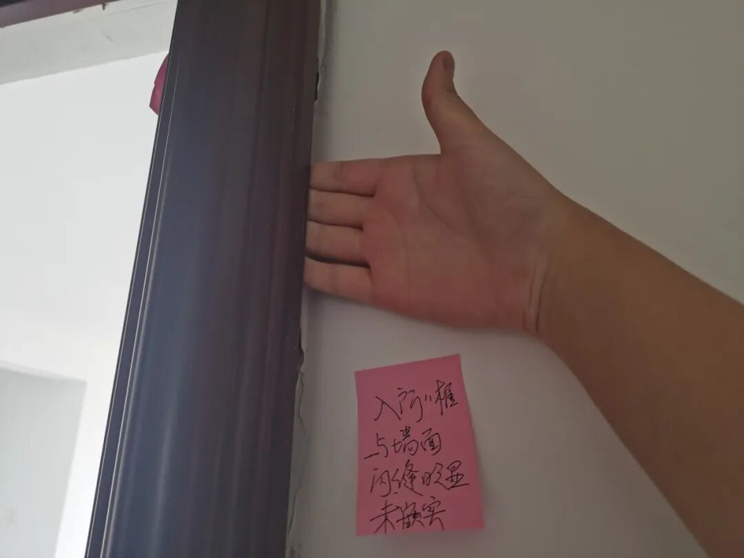 在于工检查电路同时,岳工也打开手电仔细检查门窗,此前,验房团验出的门窗问题多是划痕、缺少螺丝装饰扣帽等小问题,但林先生家的入户门问题着实看着惊人。站在门外观察,入户门看起来没有什么问题,但是用手一摸门框,岳工不禁一惊:原本应该严丝合缝嵌在一起的门框和墙壁竟然“分了家”,二者之间有一厘米多的空隙,而且越往上缝隙越大,整个门框以一个近似外倒的状态嵌在墙上。门框上方的空隙大到可以深进半截手指,里面的水泥和沙子都能清楚看到。“这个门处理成这样是肯定不行的,正常来说门框和墙面之间应严密无缝隙。”岳工说。