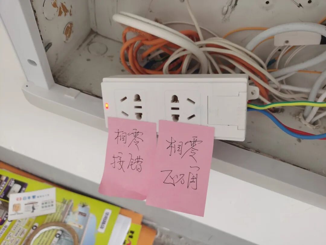 如果插座内部连接正常,按下测试按钮后,配电箱内相应电闸会自动关闭,而检查到弱电箱备用插座时,对应的电闸竟然“纹丝不动”,这个场景和首站验房时一模一样。随后,于工仔细查看了相位仪,设备显示“相零反”,即该插座的相线和零线接反,这才导致了线路在检测时无法正常跳闸。插座上有两组插孔,于工用相位仪检测另一组时则能够正常跳闸,随后于工用纸条在现场对两组插孔进行了标记。