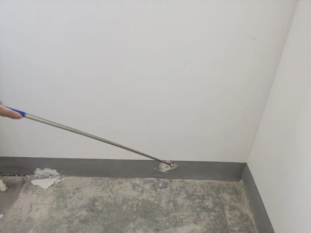 为什么会出现这个问题呢?薛总监介绍,这可能是由于工人施工不便造成的,踢脚线位置靠近地面,工人在抹灰时不容易发力,就会导致腻子层结合不牢固。