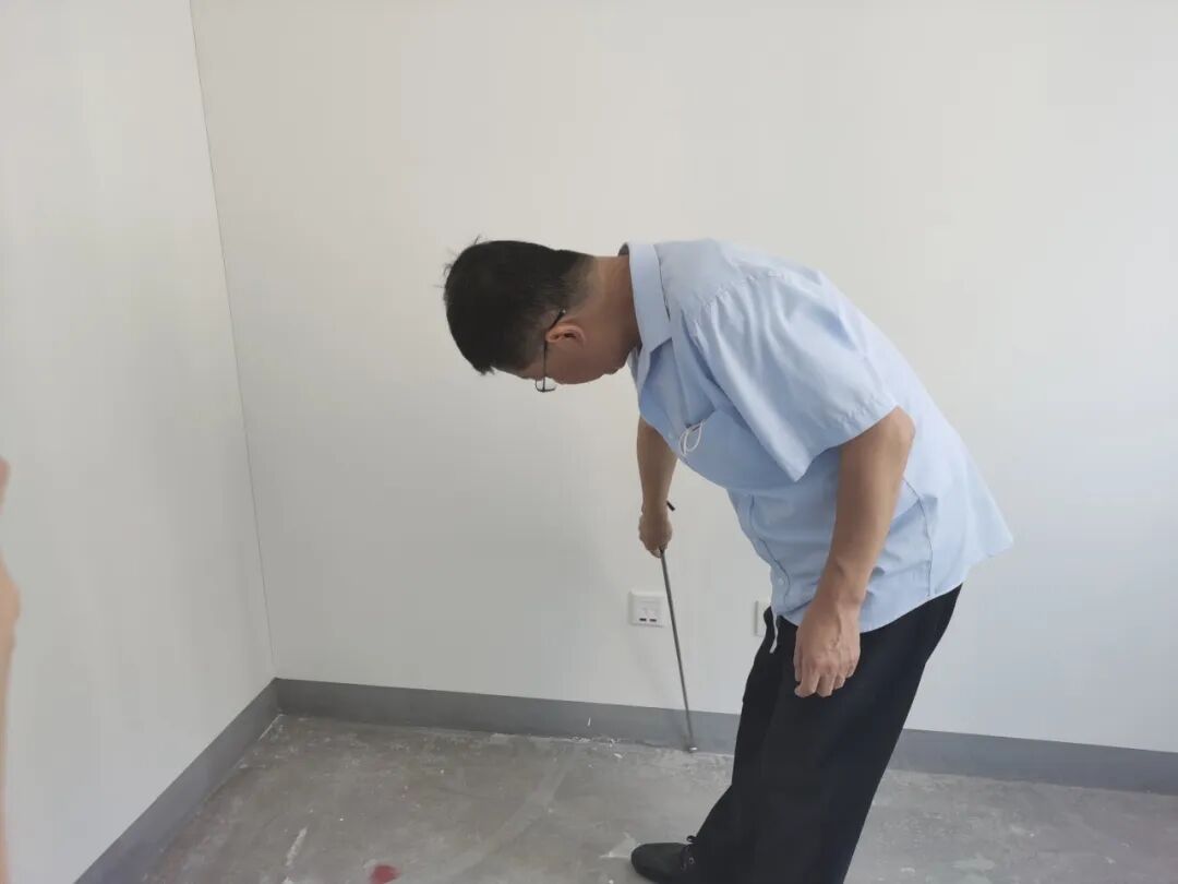 随后,验房师拿出工具勘验墙壁情况。薛总监先用靠尺检查了墙面平整度和垂直度,全屋墙面平整度表现优越,国家规定毛坯房墙面平整度误差不大于4毫米,精装不超过3毫米,而林先生家的墙面平整度差2毫米,已经达到了精装要求。随后薛总监用直角尺测量了房屋阴阳角,阴阳角方正也符合要求。“房屋墙面平整度和阴阳角很好,开间、进深也好,整体来说房屋很方正。”经过一系列检查后,薛总监对房屋提出了表扬。