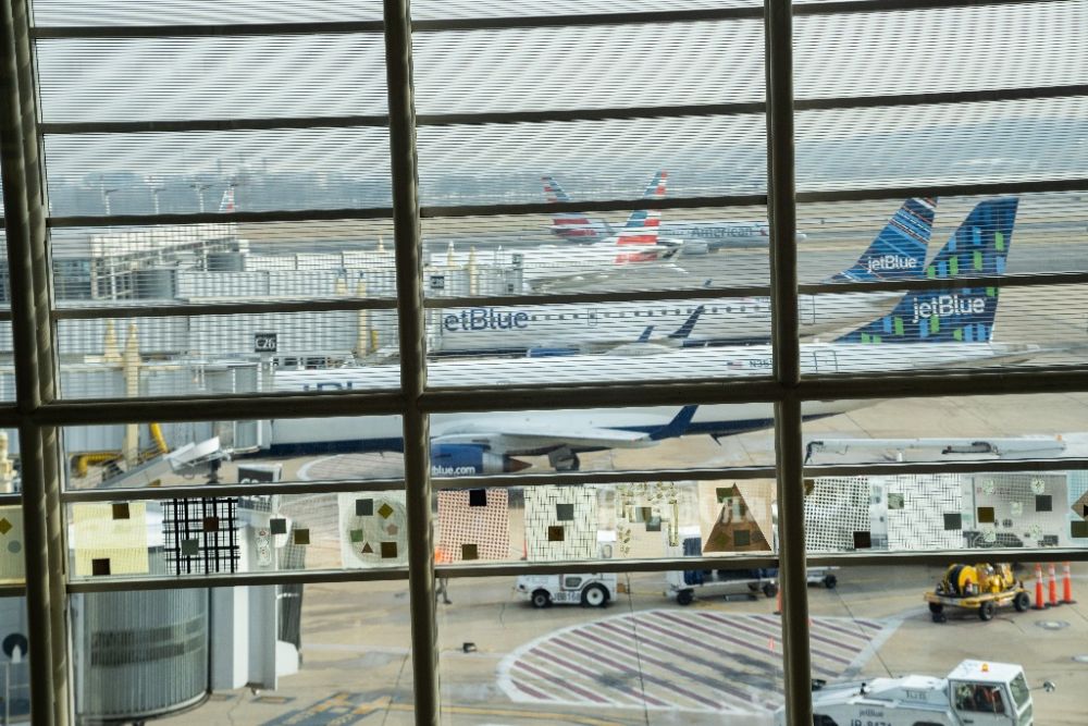 1月11日,在美国弗吉尼亚州阿灵顿的里根国家机场,飞机停靠在航站楼旁。新华社记者刘杰摄