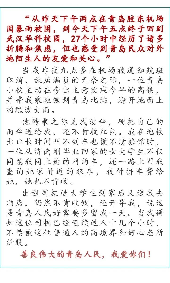 一根长夹,一个垃圾袋,2020年开始,一个一边跑步、一边捡拾垃圾的特别团队开始出现在青岛街头。跑团的发起人是青岛“90后”小伙臧绍杰,如今,跑团已从成立之初的20人发展到近200人,从最初沿八大关景区夜跑,到现在足迹遍布青岛的各个风景名胜……“在健身的同时,还能通过小小的举动传递文明意识、环保理念,让青岛更加美好,这本身就是一件很幸福的事。我们还想在网上与更多城市联动,通过运动圈让更多人爱上青岛。”臧绍杰说。2022年7月,“羊汤奶奶”的故事刷爆了青岛的朋友圈,视频里的拾荒老奶奶今年78岁了,儿子因事故高位截瘫卧床多年。羊汤店老板杨波和梁永琪发布视频后,引发全网关注,抖音浏览量破45万。视频发出后,青岛市残疾人福利基金会第一时间为老人开通了“共梦筹”定向捐款通道,得到了社会各界爱心人士的积极响应。如今,杨波和梁永琪兄弟二人成了老人家的常客,在杨波晒出的合影中,老人的脸上绽放着灿烂的笑容。守望相助、美美与共,涓涓善意在这座城市间流淌。“这件事我最大的感受就是,一方有难八方支援,我们任何一个人都不会被这座城市抛弃,大家都深深信任着、热爱着、守护着这个有爱的社会大家庭。”梁永琪说。同样在2022年夏天,从湖北来青出差的老教授刘玉,在青岛的风雨中感受到一股暖流。突降暴雨、航班取消、打不到车、旅店满员……就在刘玉一筹莫展时,身边的青岛小伙仇天龙伸出援手,打伞护送她到地铁站。善良的女学生、热情的的哥……在回去的路上,一路都有热心人的帮助。“善良伟大的青岛人民,我爱你们!”刘玉一条发自肺腑的朋友圈,在短短几个小时便获得274个赞。随后,#青岛市民接力帮助暴雨滞留教授#话题冲上微博热搜,获得众多网友的点赞。