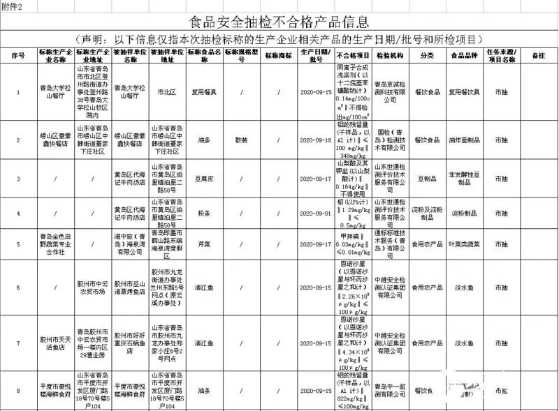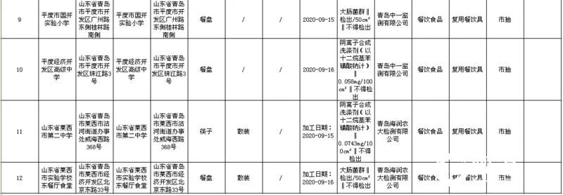 餐饮环节,共有12批次食品不合格,不合格最多的是餐盘、筷子等餐具,有5批次,有的检出了大肠菌群,有的检出了洗涤剂成分;值得注意的是,这些不合格餐具的来源都是学校食堂,有青岛大学松山餐厅、平度市国开实验小学、平度经济开发区高级中学、山东省莱西市第二中学和山东省莱西市实验学校东餐厅食堂。