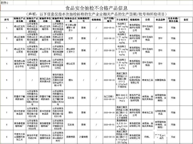 其中,在生产环节,共有不合格食品11批次,基本都是散装的,其中不合格最多的是茶叶,包含崂山绿茶和红茶,共有4批次;问题都是检出农药残留,吡虫啉(一种烟碱类超高效杀虫剂)含量超标。其次是馒头、火烧、花生油,分别有2批次,还有一批次的蒜蓉烤肠不合格。