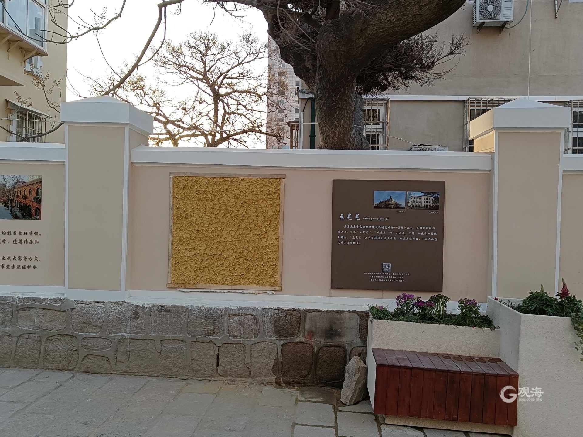 据悉,展示墙位于圣弥厄尔教堂广场至四方路历史文化街区大鲍岛区域的道路西侧,利用肥城路7号原有的长约30米老墙面,制作了点晃晃、水刷石、水洗砂、甩石子、扒拉石等5种传统工艺工法样板,并附有每项工艺的简介,既是展示墙又是施工工艺的推广。同时扫描现场的“青岛历史建筑”二维码,还可以更加详细的阅读《青岛市近现代历史建筑修缮施工导则》和《青岛市历史风貌建筑修缮工艺工法图鉴》,便于市民更加深入地了解我市历史建筑的工艺工法。