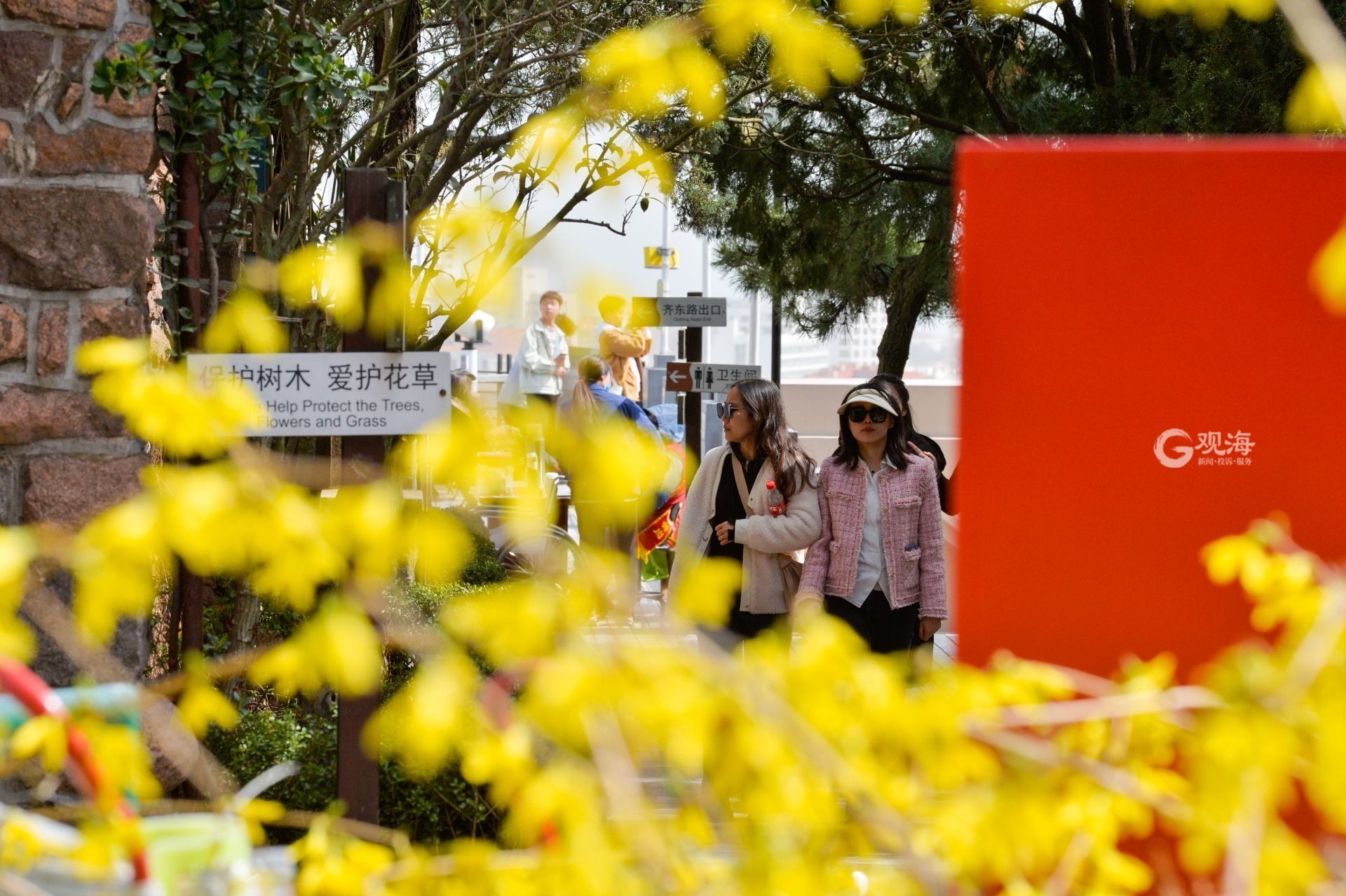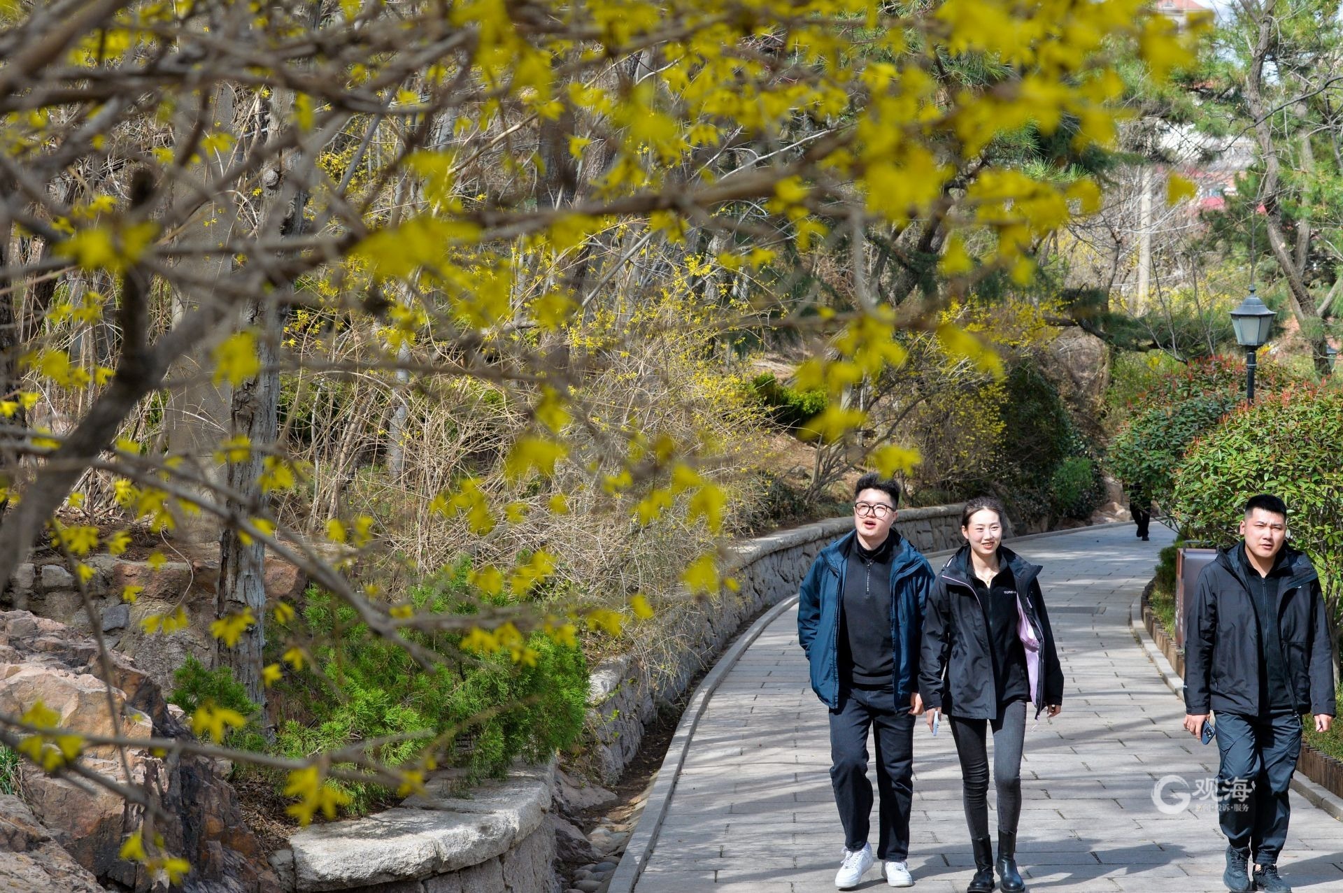 - 连翘花吸引游人驻足拍照。