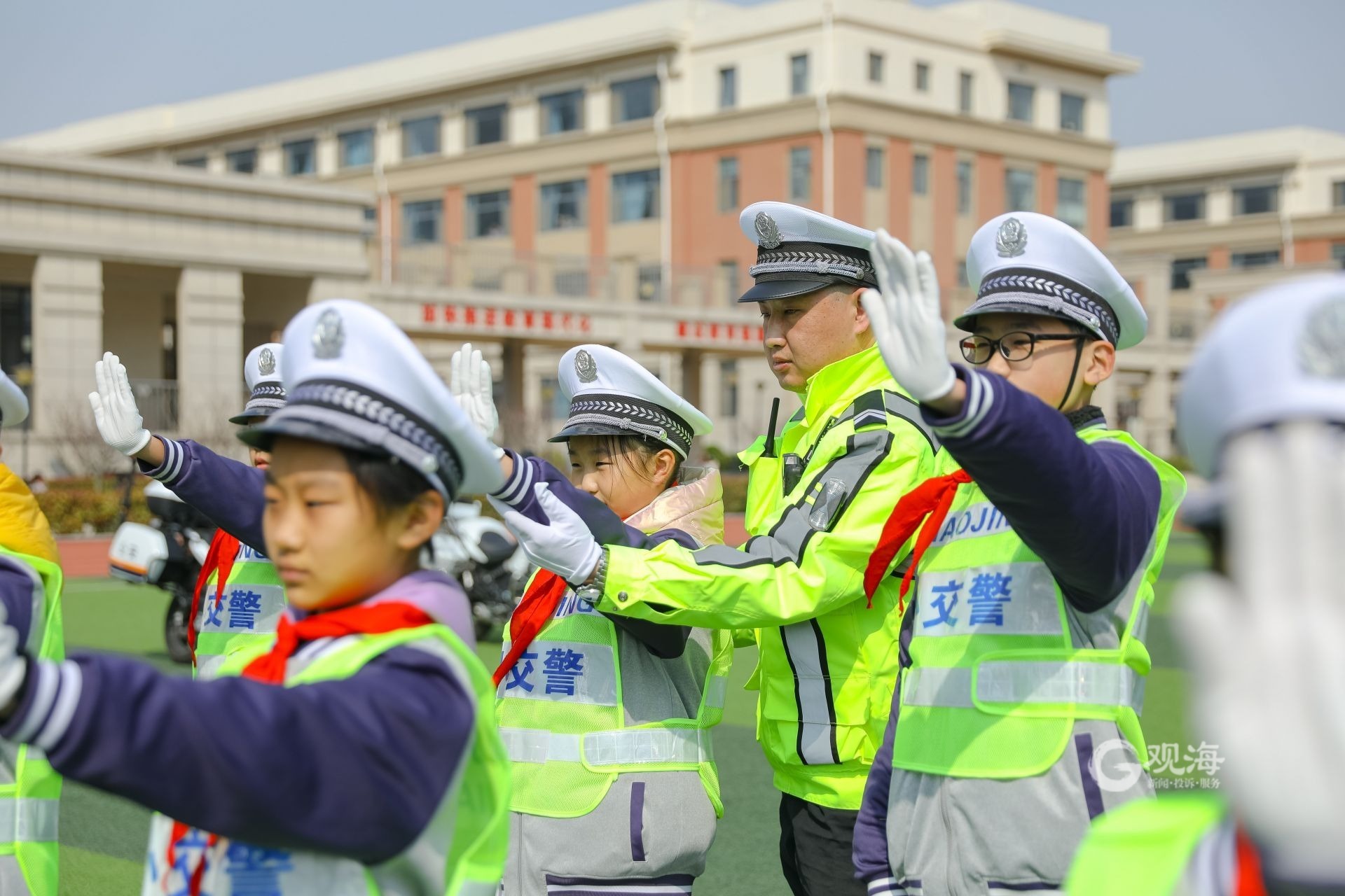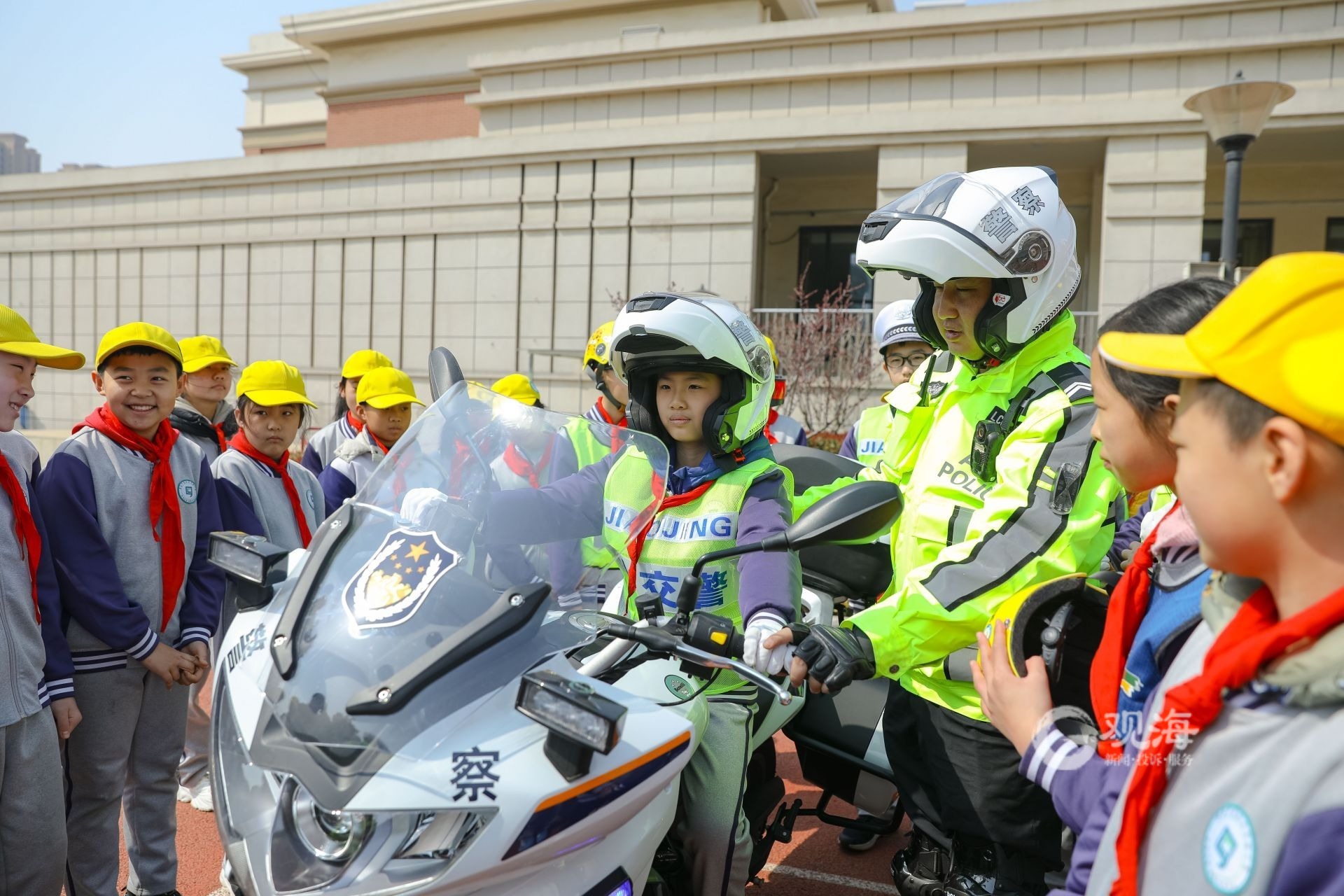 - 3月27日是第28个全国中小学生安全教育日。青岛市公安局交通警察支队李沧大队走进青岛文正小学,通过讲解交通安全常识、标志标识、正确使用“一带一盔”。带孩子们学习交通指挥手势操,近距离体验警用摩托车,让大家在学习交通安全知识的同时增强安全意识和自我保护能力。(观海特约摄影师 张鹰 摄 | 责任编辑 樊蓉)