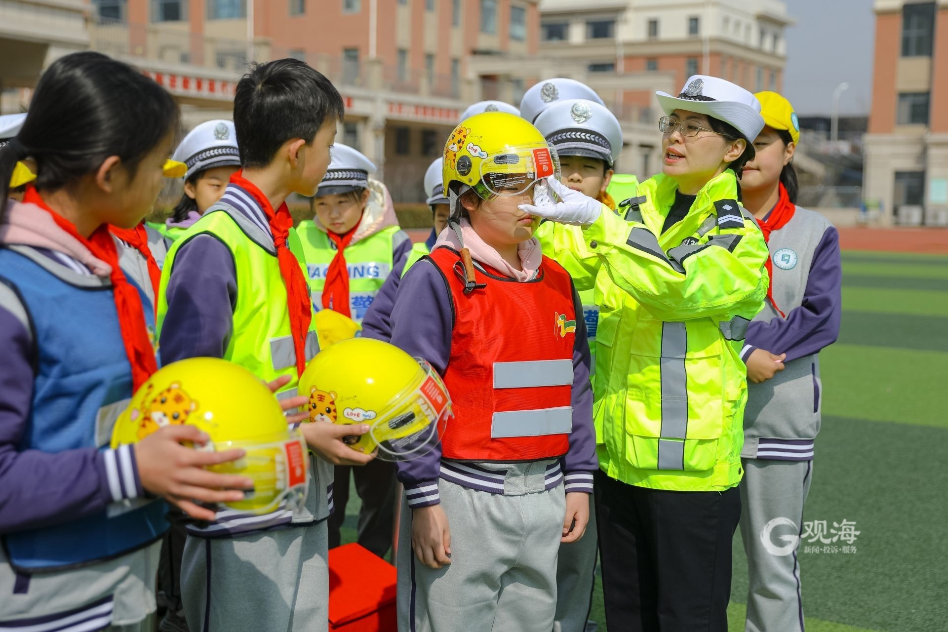 - 交警为小学生讲解佩戴安全头盔注意事项。