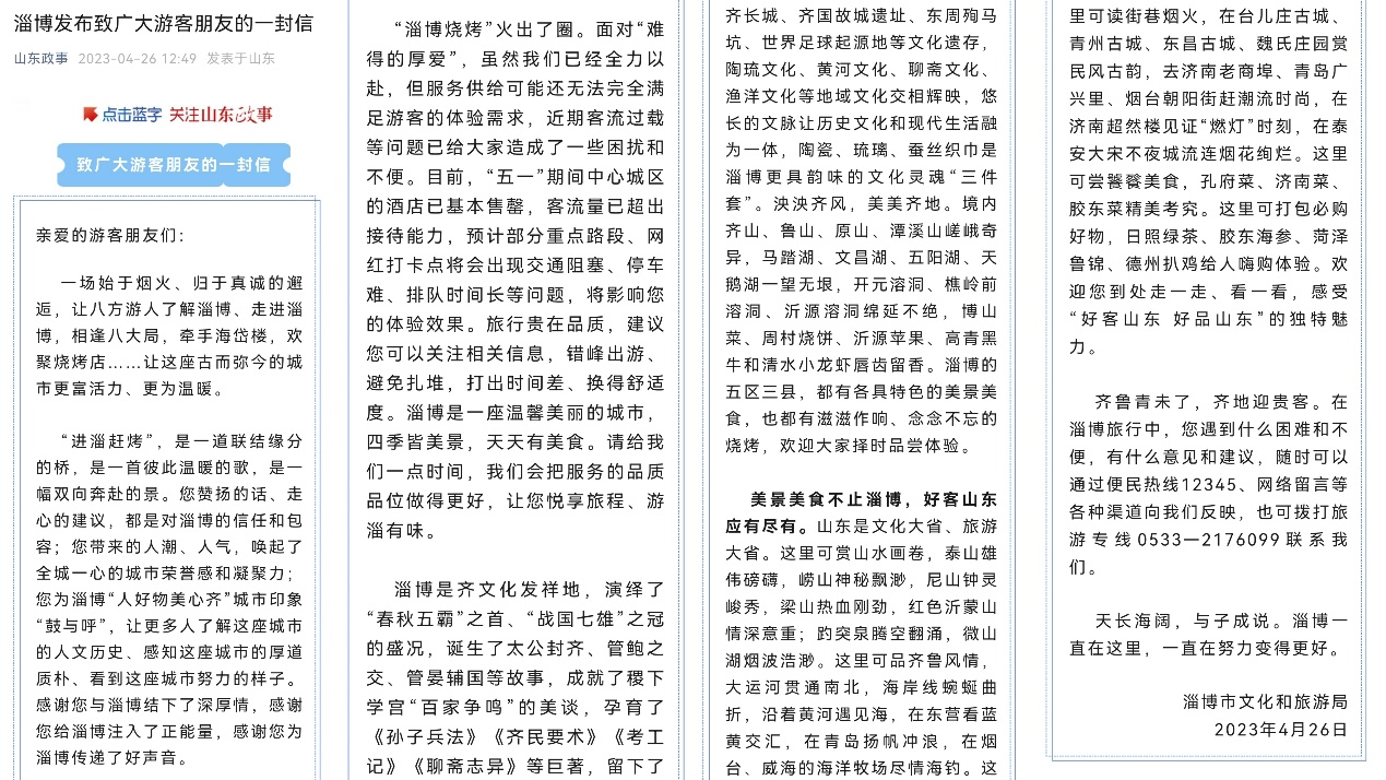 “目前,五一期间中心城区的酒店已基本售罄,客流量已超出接待能力……建议您五一打出时间差,换得舒适度。”4月26日,淄博市文化和旅游局发出《致广大游客一封信》,一面温馨提示游客错峰出游,一面替山东其他城市“打广告”,欢迎广大游客到山东各地走一走,看一看,感受“好客山东好品山东”的独特魅力。