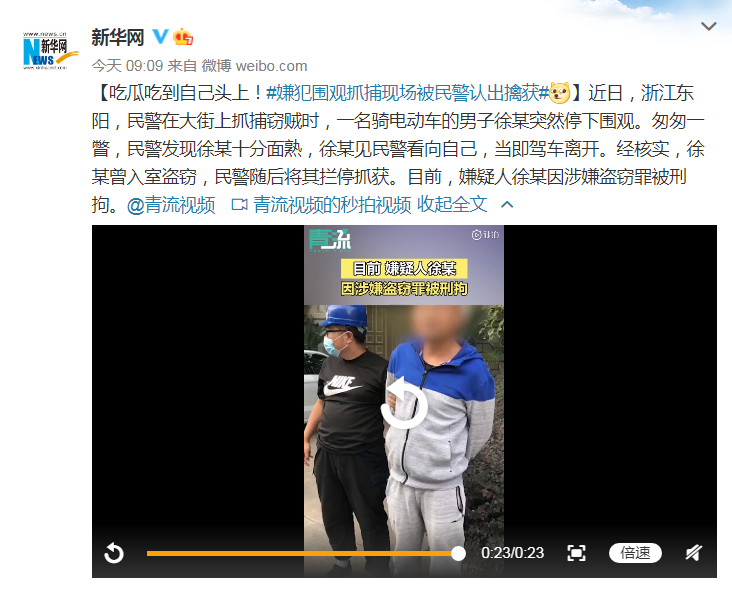 近日,浙江东阳,民警在大街上抓捕窃贼时,一名骑电动车的男子徐某突然停下围观。匆匆一瞥,民警发现徐某十分面熟,徐某见民警看向自己,当即驾车离开。经核实,徐某曾入室盗窃,民警随后将其拦停抓获。目前,嫌疑人徐某因涉嫌盗窃罪被刑拘。 责任编辑:程雪涵 0