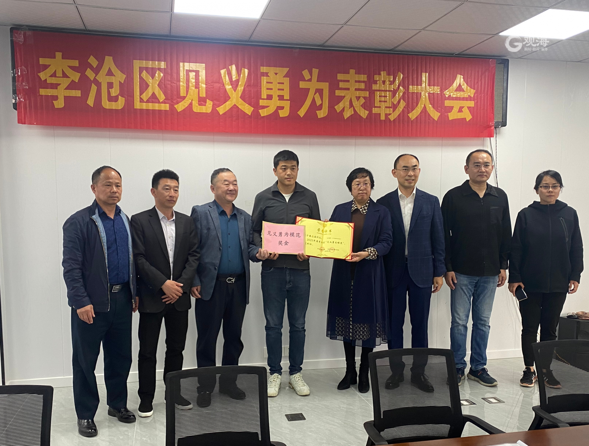 戴志磊(左四)被评为“李沧区见义勇为模范”。