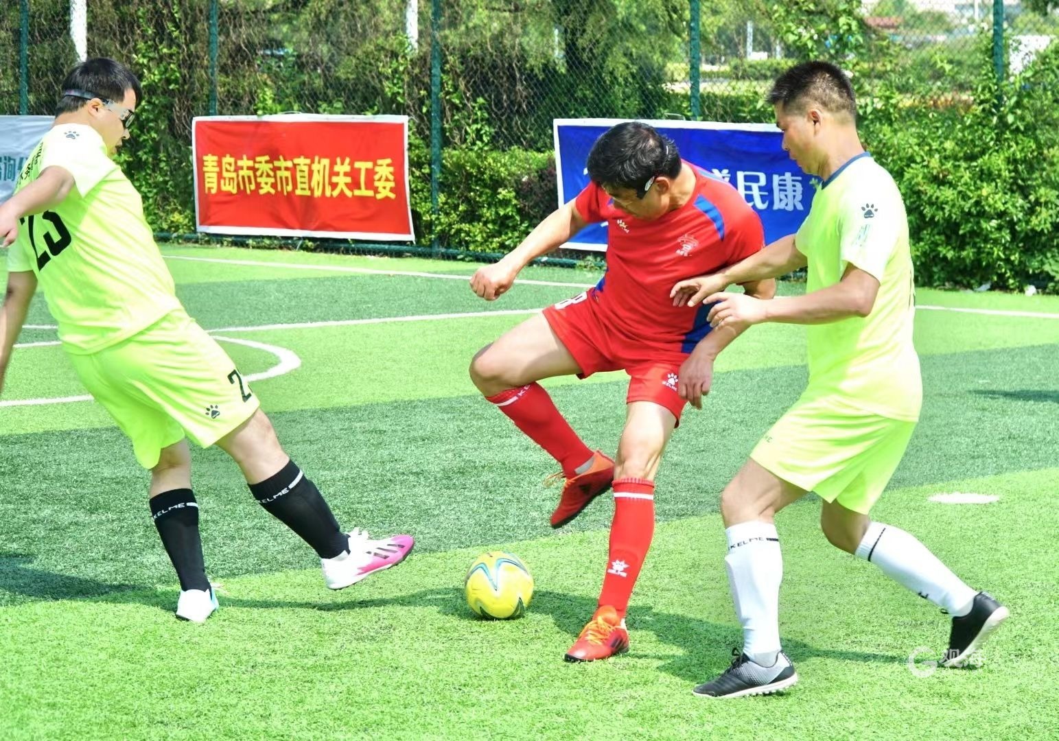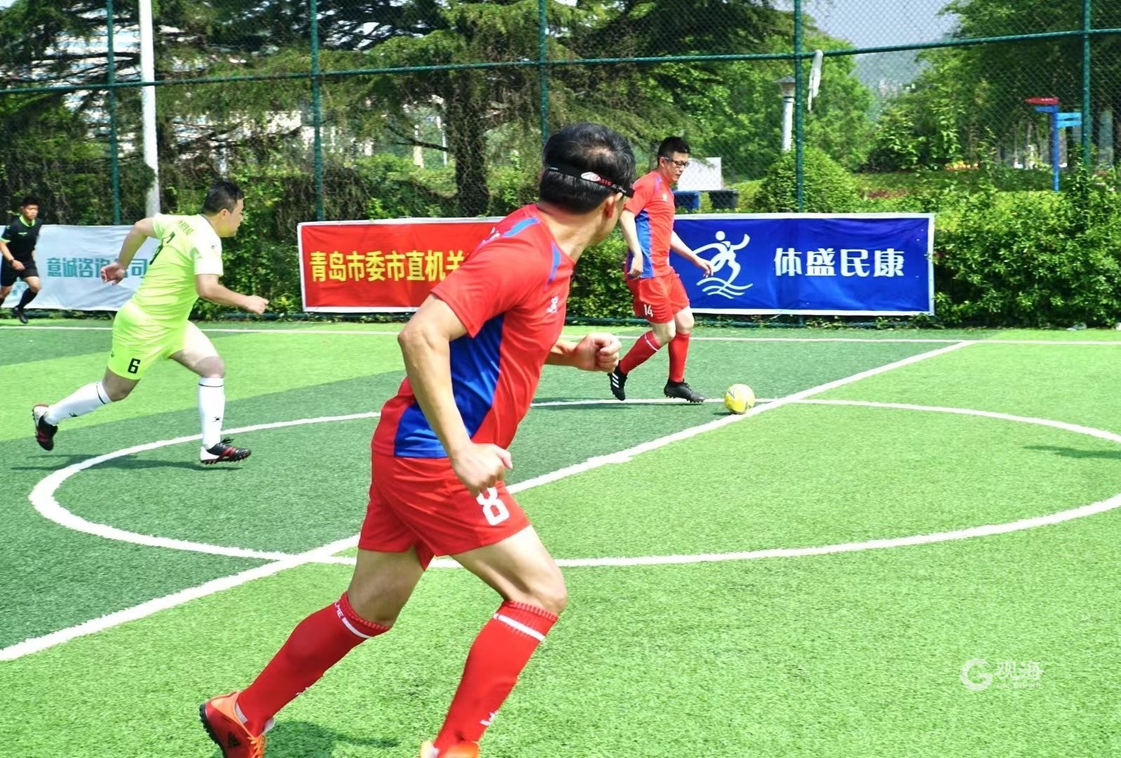 青岛日报社/观海新闻5月20日讯 今天上午,第三届“山东意诚咨询杯”青岛市市直机关五人制足球赛开幕式在汇泉壹号足球场举行。来自市直机关的41支队伍将在接下来两个月的时间里展开绿茵角逐。揭幕战上,卫冕冠军市委宣传部再度展现强大实力,以7比2击败对手,赢得开门红。