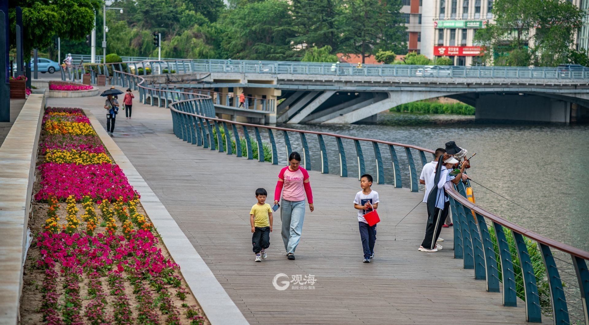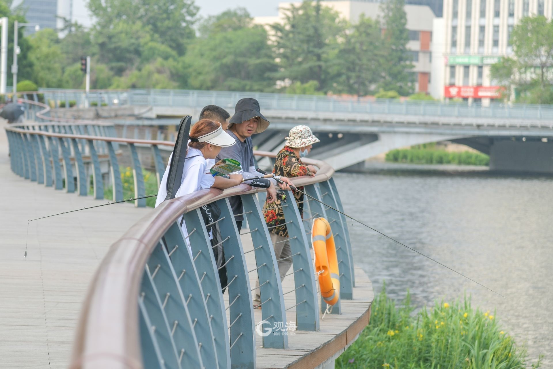 - 市民在河边悠然垂钓。