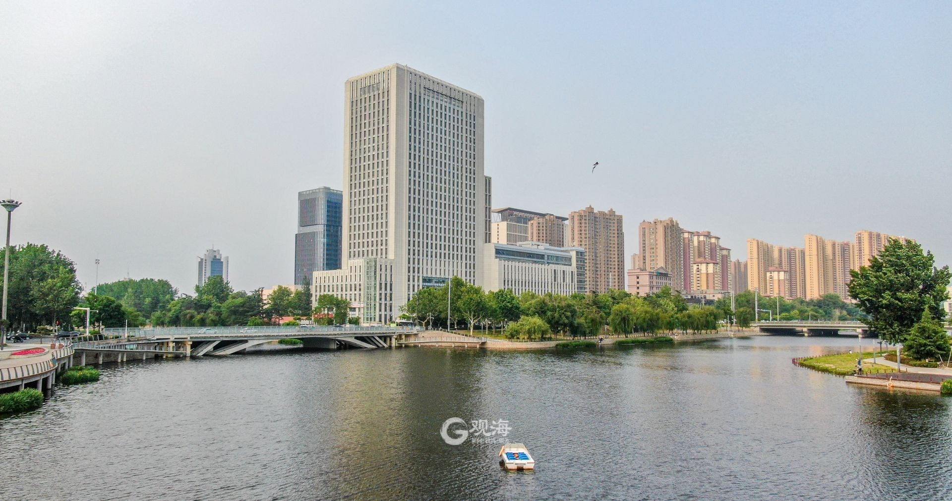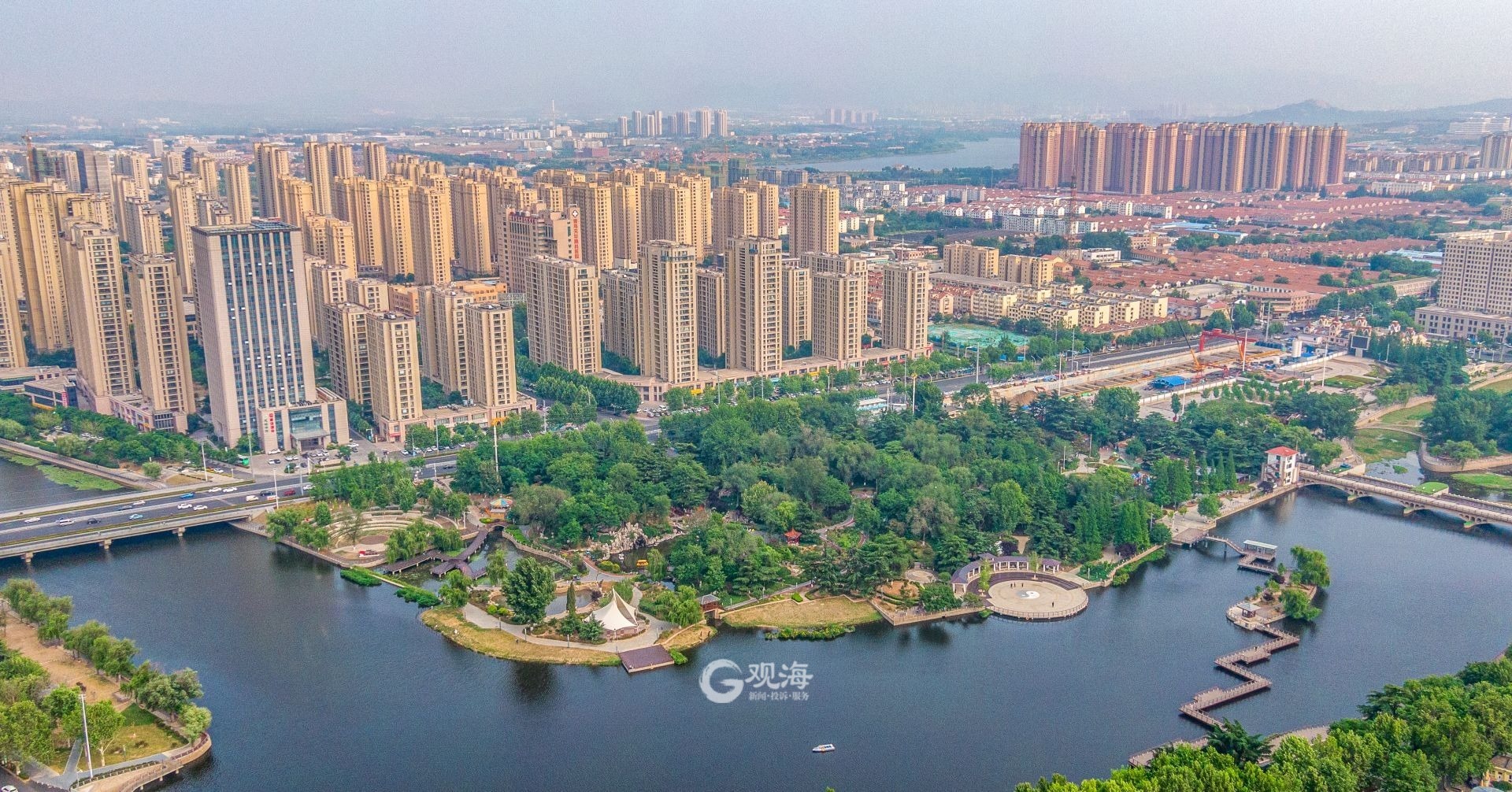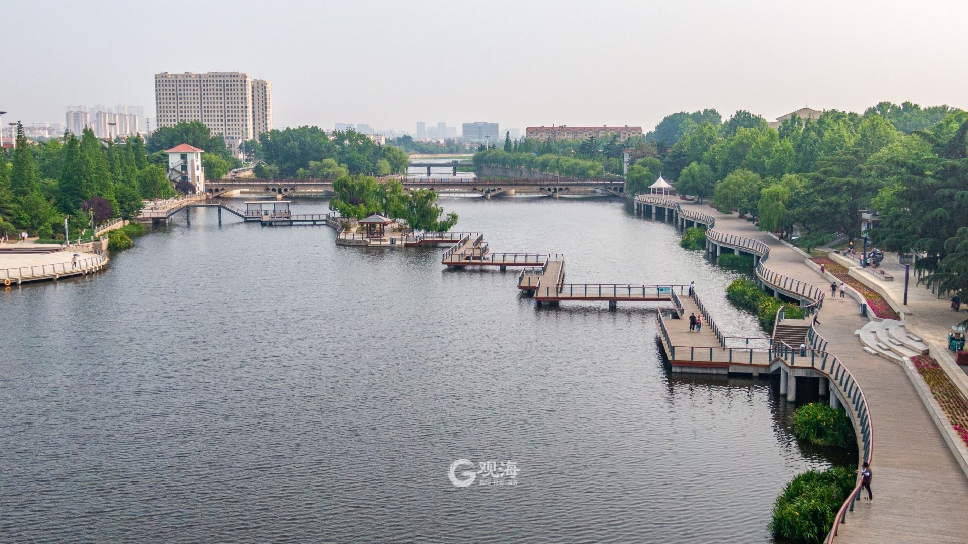 - 航拍河面,墨河公园尽显初夏风光。