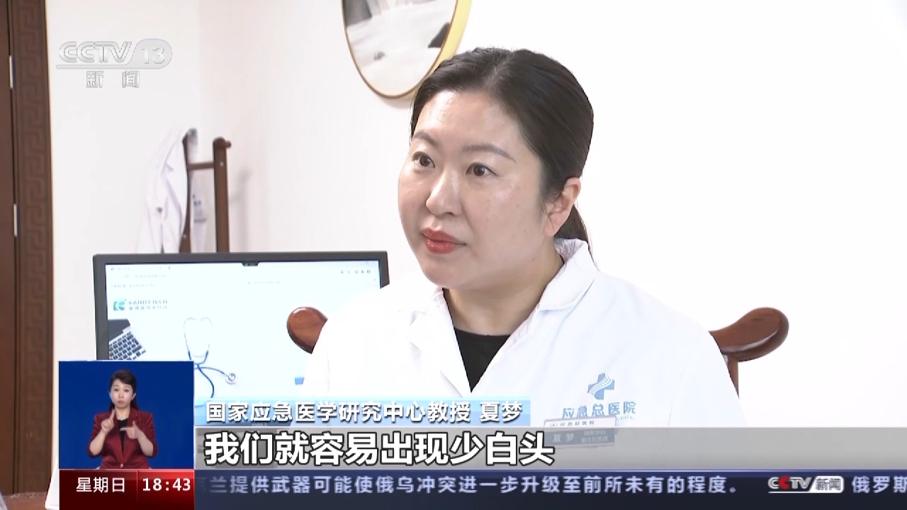 国家应急医学研究中心教授 夏梦:第一点我觉得对于少白发的人来说,其实最重要的一点就是劳逸结合,太过疲劳的时候,不仅损伤气血,对于神经系统分泌的这些介质,也会产生改变。第二个其实就是我们的手这样五指,我们可以从头皮上面这样去梳,也可以这样轻轻地扣。其实这样梳跟扣,对于我们头皮的局部的血液循环,有一个很好的改善,我建议大家三分钟就足以了。第三方面我觉得吃至关重要,那么饮食一定是首先摄入的物质要有营养,我觉得一定第一点是要摄入优质蛋白,比如说牛肉、虾、牛奶、鸡蛋等等。第二个方面就是复合维生素,也就是说多种微量元素,以及维生素的摄入,这些都会含在我们的绿叶菜跟新鲜水果当中。