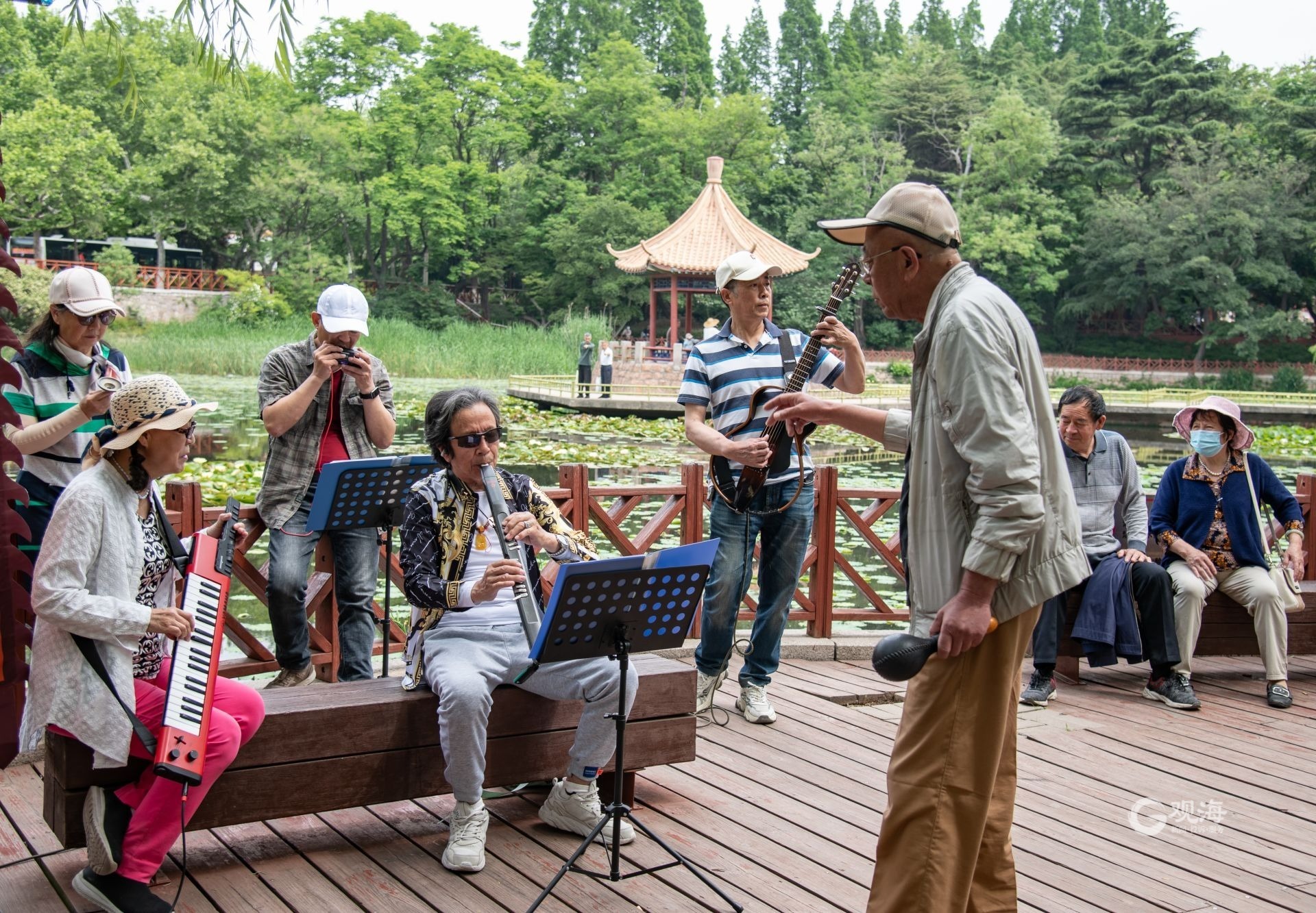 不远处,悦耳动听的合奏声飘扬在小西湖上空,这群演奏者是平均年龄60+的青岛牧童组合。“我们是一群老顽童,都爱好音乐,为丰富老年生活,就组了个组合,开始我们是在室内练习,去年起把演奏场地搬到了室外。”演奏者解增平说,在这里演奏一年多,也是见证了这里的变化,适老化设施更多,绿化也更怡人。“多了不少坐凳,可以方便老年人休息,而且景致优美,我们每次演奏录视频也好看。”