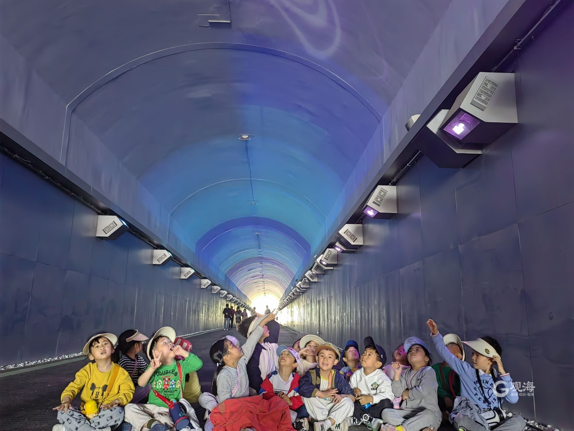 最近的一次爬山日,于月梅和老师们带孩子们“打卡”的是浮山防火隧道。据了解,浮山防火隧道虽然总长度仅169米,但却贯穿浮山山体,从浮山北坡的“山后”步行即可抵达南坡“山前”。同时,在隧道的穹顶、地面上,还能投射出星辰、大海、繁花等不同图案的灯光秀,游览体验丰富。