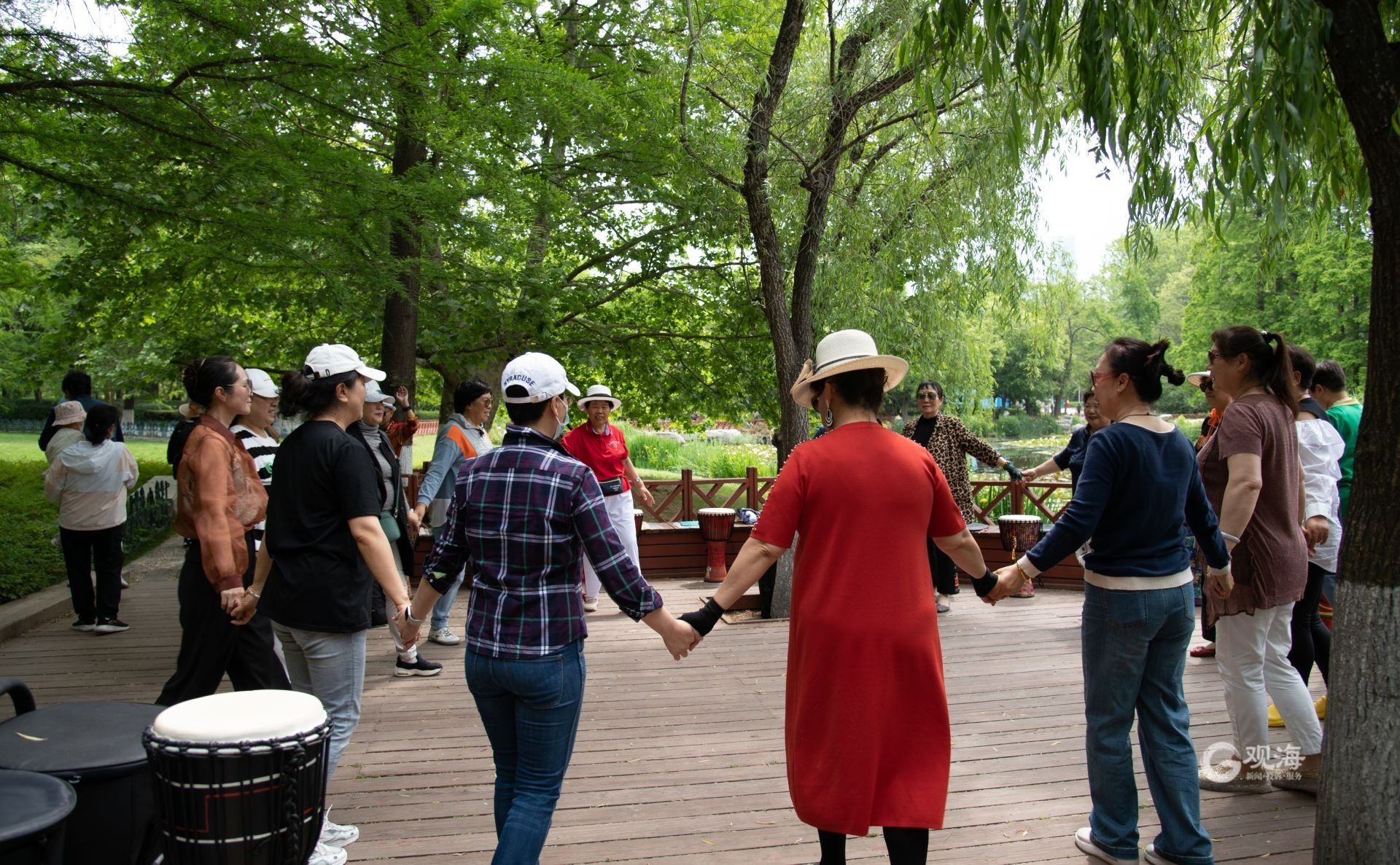 循节奏欢快的乐声而行,在西南水面旁,一群中老年人或尽情击打鼓面、或和着节奏舞动,用“鼓语”沟通,体验着同频共振的快乐。“这里景致好,又免费,我们老年人在这里一起乐呵,心情很畅快。” 王浤是鼓韵笙歌鼓友会的发起者,起初,她跟另一个老姊妹希望能有处户外活动的空间,就约定来公园里打非洲鼓,后来越来越多的中老年人被这种活力感染,陆续加入了进来。“最早,我们就两个人,现在壮大到了150余人,大家平均年龄在60+,每周起码得有几十人参加活动。这里为中老年人提供了一处休闲娱乐的空间,丰富了我们的业余生活。”