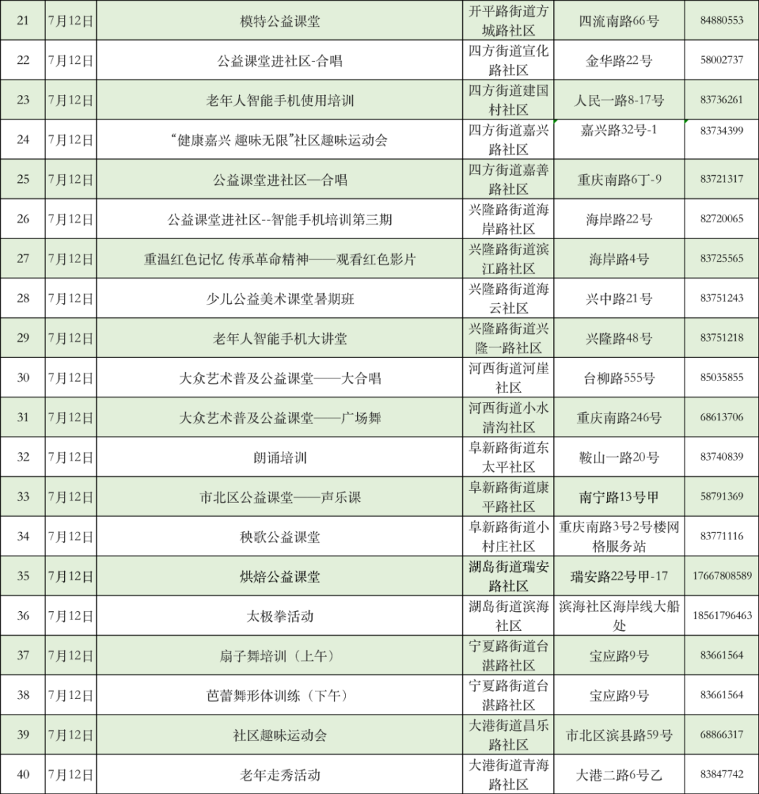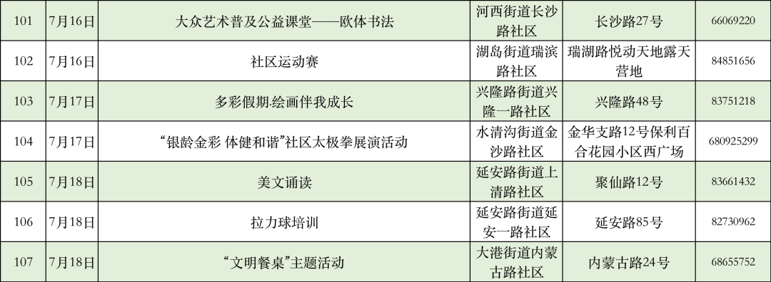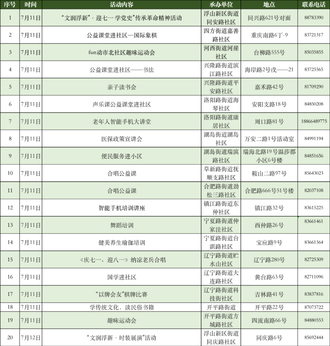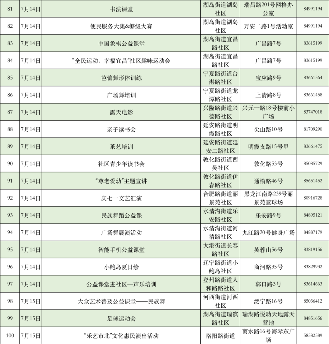 七月的晴空 像极了被打翻调色盘的油画 7月11日至18日 市北区各街道、社区 丰富的文化活动 伴着清风蝉鸣 如约而至 一起往下看吧 ⬇️⬇️⬇️ 精彩文娱活动 丰富居民生活 如果有想要参加的活动 记得联系街道~ 0