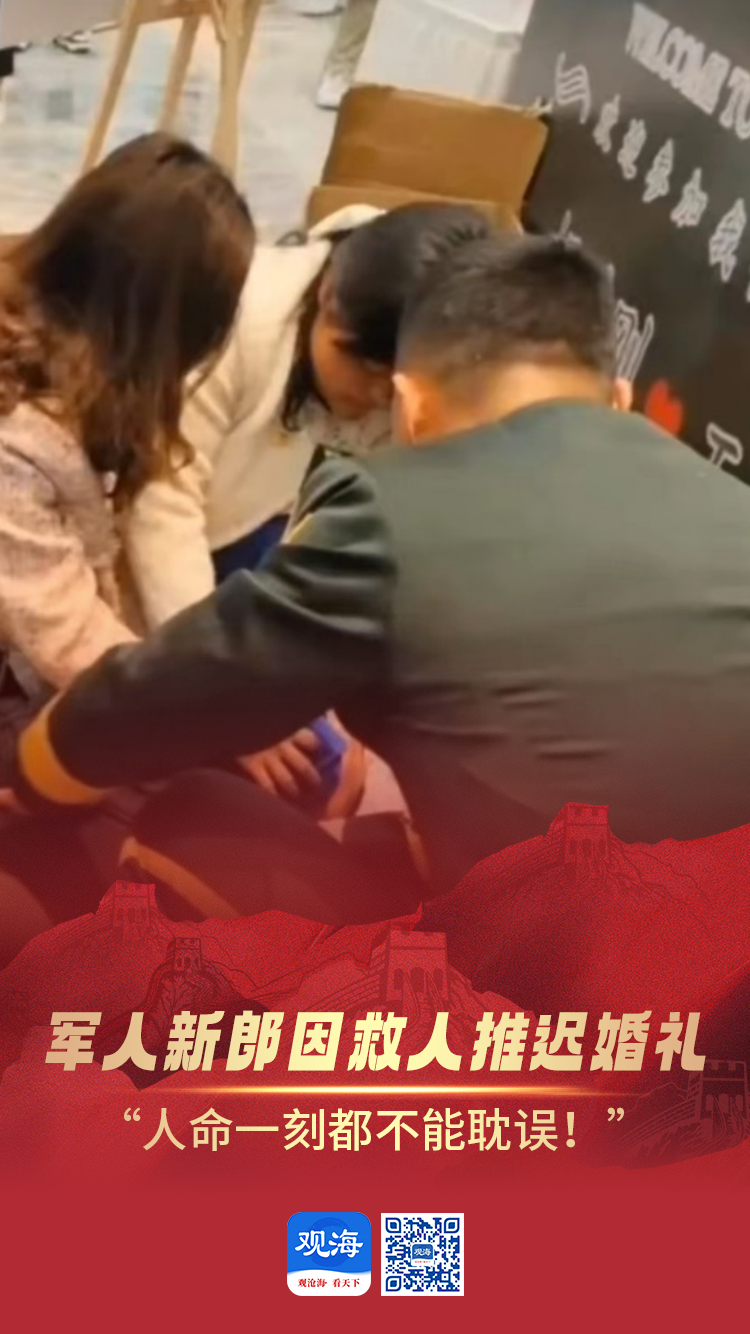 “快来救人,有人晕倒了!”近日,在江苏淮安,陆军第72集团军某旅二级上士胡鹏刚的婚礼即将开始,听到呼救声后,他迅速冲了过去。他初步判断患者是癫痫发作,失去意识,随即对其展开急救。胡鹏刚手指被咬破,婚礼推迟了20分钟举行,他说:“婚礼可以推迟,但人命一刻都不能耽误!”