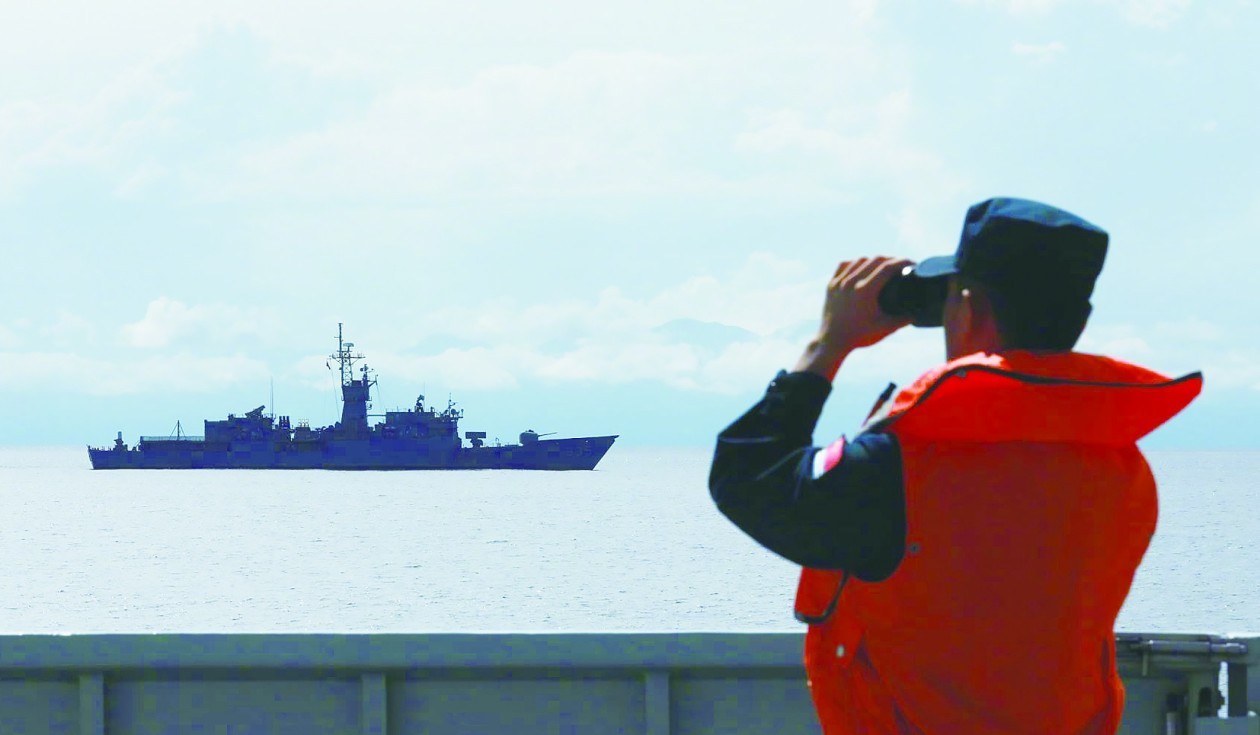 解放军水兵在演习中监控台军舰艇。(央广军事微博)