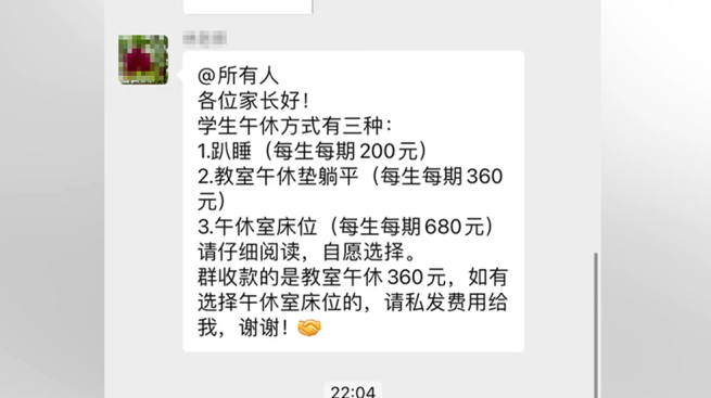 学生趴在课桌上午休还要收费?近日,有家长晒出广东东莞一所民办学校老师收取午休费用的群聊截图,根据截图显示,学生午休收费有三种:趴睡(每生每期200元)、教室午休垫躺平(每生每期360元)、午休室床位(每生每期680元)。该学校的做法一经曝光,便迅速登上多平台热搜,引发网友热议。