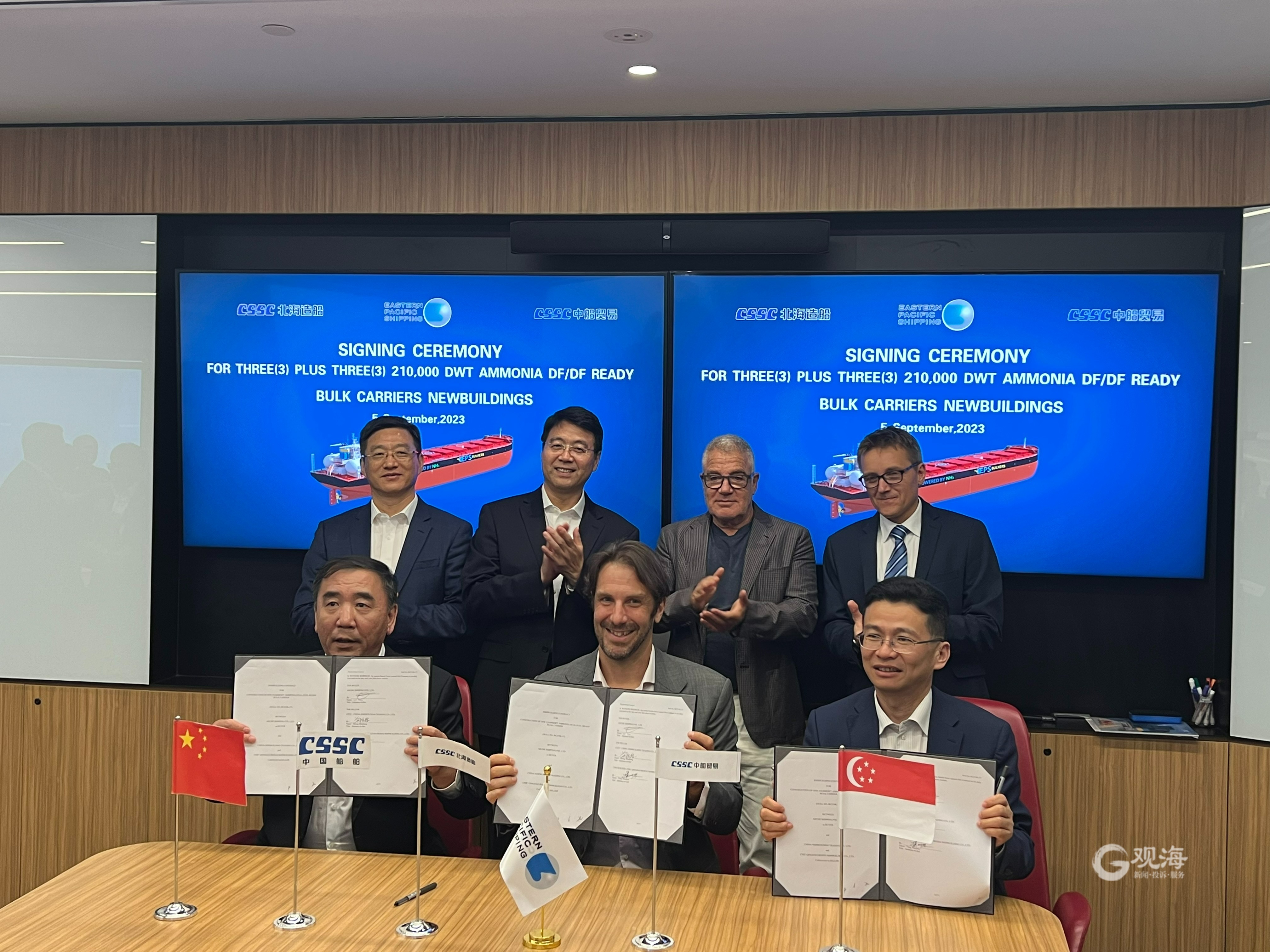 青岛日报社/观海新闻9月7日讯 9月5日至9月6日,中国船舶集团青岛北海造船有限公司联合中国船舶工业贸易有限公司,分别与新加坡东太平洋航运签署3+3艘21万吨Ammonia DF/DF Ready散货船建造合同,与韦立国际集团签署两艘32.5万吨矿砂船建造合同。签约仪式在新加坡举行,开启了北海造船与新加坡东太平洋航运、韦立国际集团的首次合作。
