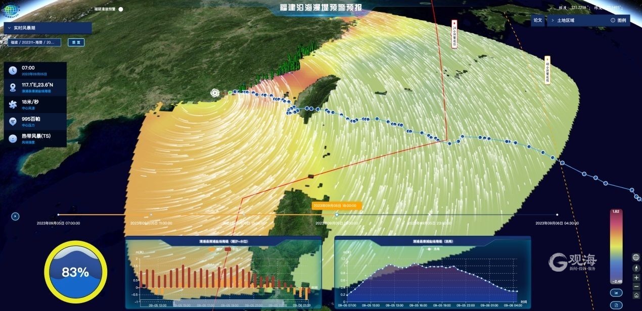 目前,该系统在对2023年第5号台风“杜苏芮”和11号台风“海葵”的漫堤预报中表现良好,准确预报出了福建海域的漫堤危险等级信息,并推送给相关预报部门,为防灾减灾提供了科技支撑。