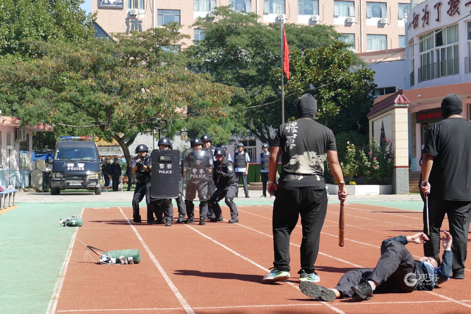 活动现场,人头攒动,师幼兴趣盎然,观看李沧特巡警大队的民警展示应急拉动演练。化妆“歹徒”欲持刀袭击群众,民警闻警而动,迅速出击。“警察,不许动,放下武器!”PTU民警通过团队配合,切断“歹徒”之间相互联系,将“歹徒”控制,保护群众撤离现场。精彩的表演,熟练的配合,快速地处置,赢得了师幼们阵阵欢呼。