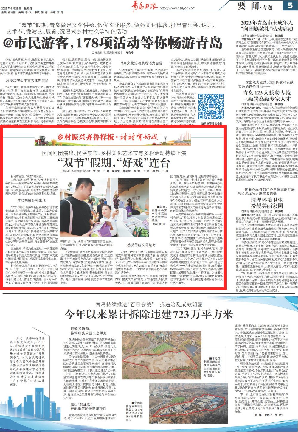 中秋、国庆“双节”将至,作为“乡村振兴齐鲁样板——村村有好戏”系列活动的重要组成部分,青岛备下了丰富多彩的文旅体活动,邀请广大市民参与其中,感受青岛全面推进乡村振兴、唱响“五台戏”的火热场面和生动场景。