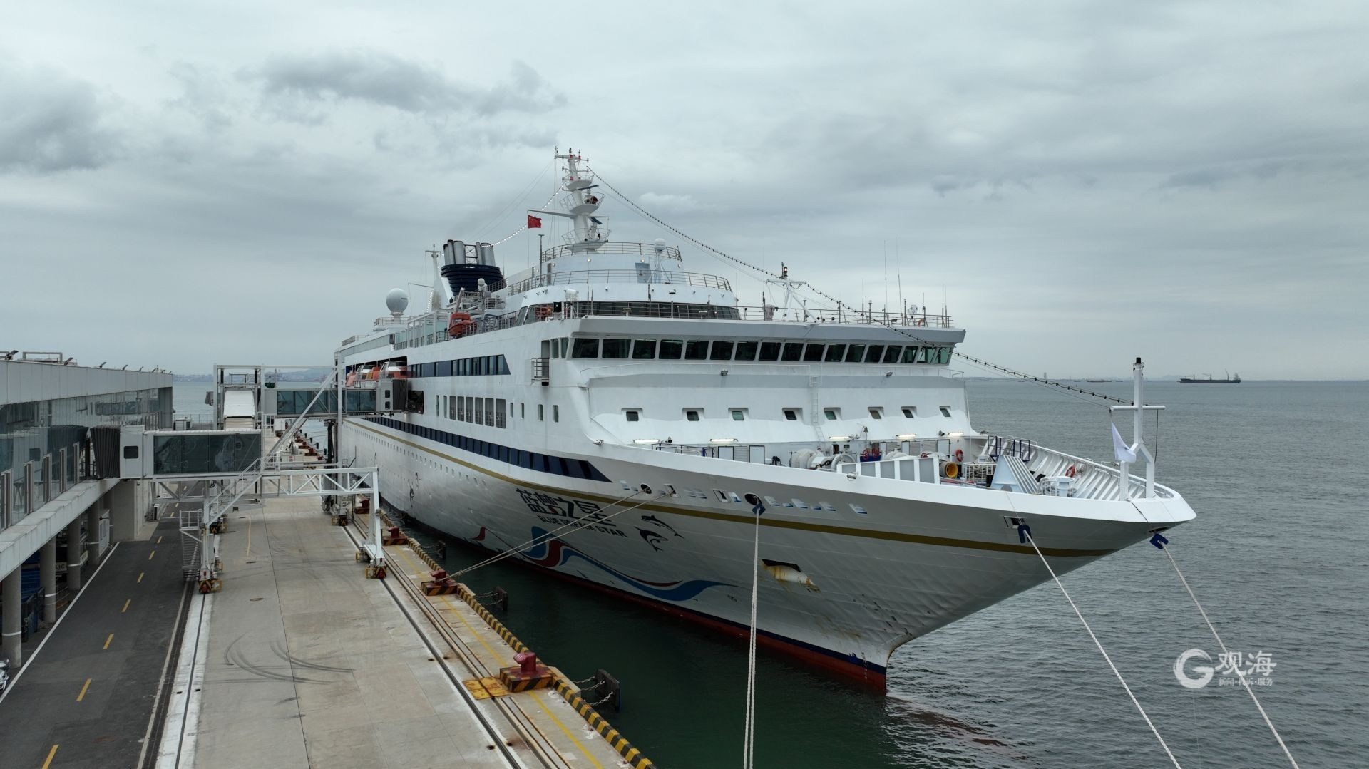 9月29日下午停泊在青岛邮轮母港的“蓝梦之星”号邮轮,当晚从青岛拔锚起航。邢志峰 摄