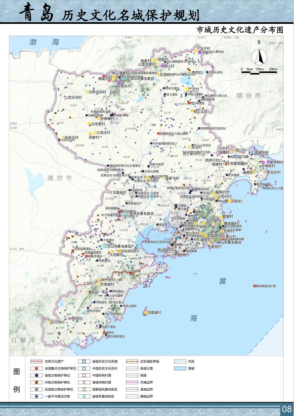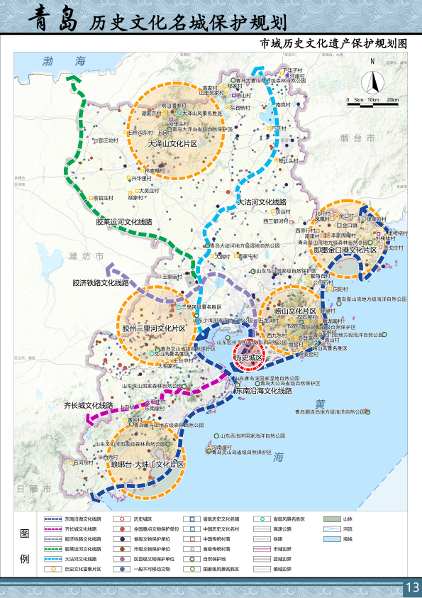 2.保护大沽河、胶莱运河、齐长城、胶济铁路和东南沿海等五条历史文化线路及其串联的沿线相关遗存;