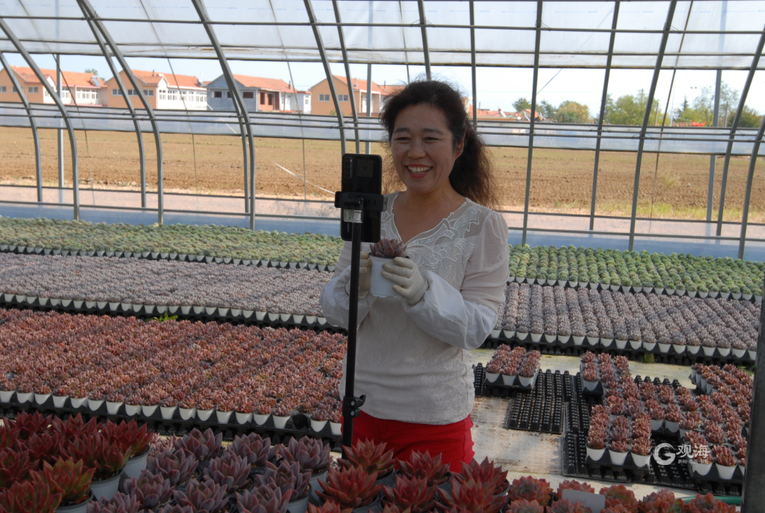 青岛日报社/观海新闻10月17日讯 “亲们,这个‘果冻乙女星’是咱家目前卖得最好的多肉品种,买一盆放在家里既美观好看又能减轻辐射,净化空气,喜欢的肉粉们抓紧购买。”10月17日,在即墨区田横镇王戈庄村的多肉植物种植大棚内,农民正在直播带货。