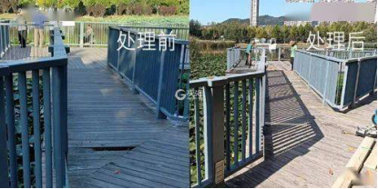 李沧区城市建设管理局工作人员收到报料后,第一时间到达现场勘察情况,组织园林维修工人开展快速、精准的修复工作,并对防护围栏进行加固修缮,确保公园木栈道尽快恢复安全稳固状态。